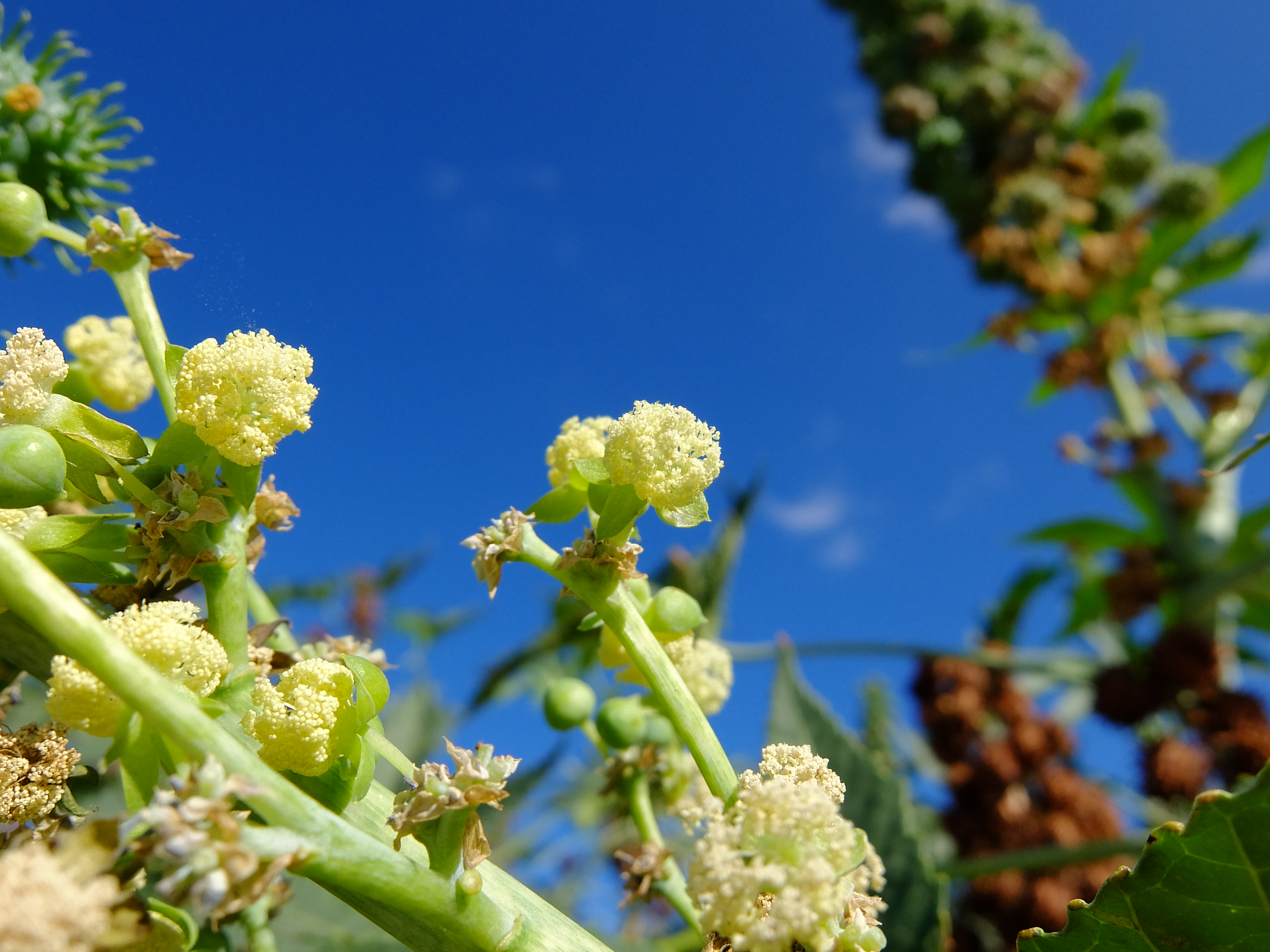 カリフラワーみたいな花・・・これはトウゴマの花です。トウゴマは、トウダイグサ科トウゴマ属の多年草。シチリアの野原や空き地に、これでもか!というほど繁殖しています。種に有毒物質であるリシンを含むというものの、人間や小動物が誤飲したとは聞いたことがありません。(たぶん)多くのひとは、単なる雑草としか見ていないのでしょう。トウゴマから採る油=ひまし油(向かって右後方に茶色く写っているのが種で、これから油を採ります)は、日本では、便秘薬や燃料として使われます。夫に尋ねたところ、「シチリアでも、昔は、下剤として使った」と言っていました。