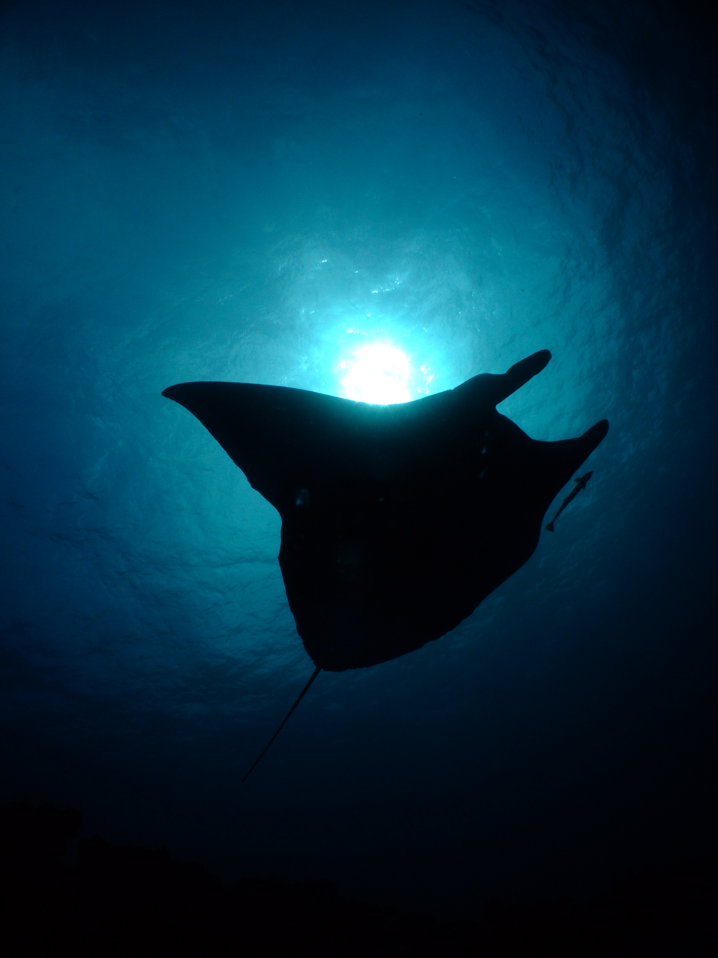 マンタ 海 生物 コバンザメ 水中 影 逆光 太陽 光 青 水色 泳ぐ