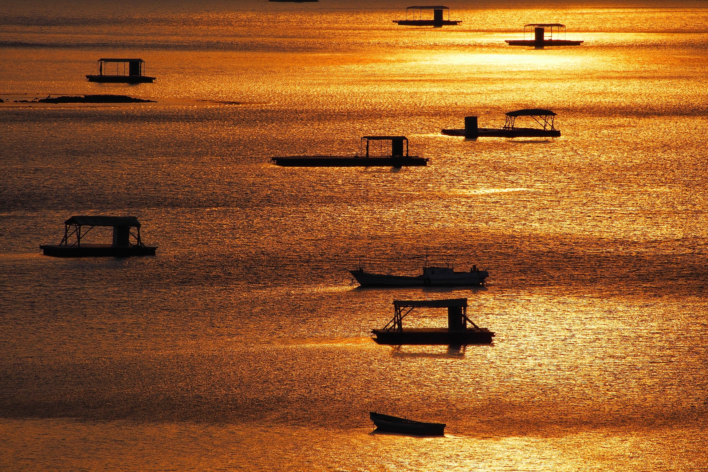 釣り用の筏が浮かぶ様子です。筏には簡易トイレと日除けテントが設置されています。