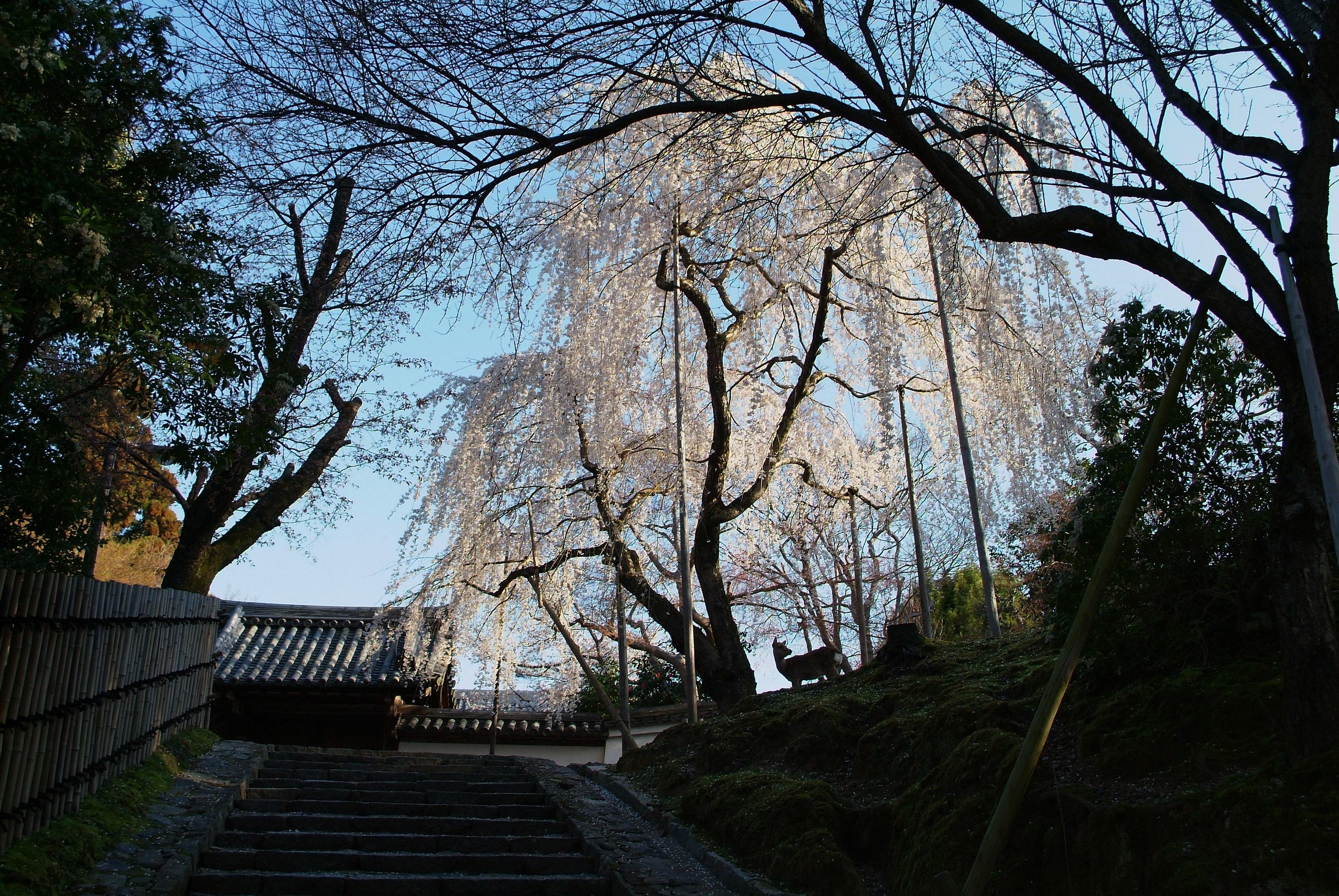 朝日を浴びた枝垂れ桜の下に一匹の鹿。
