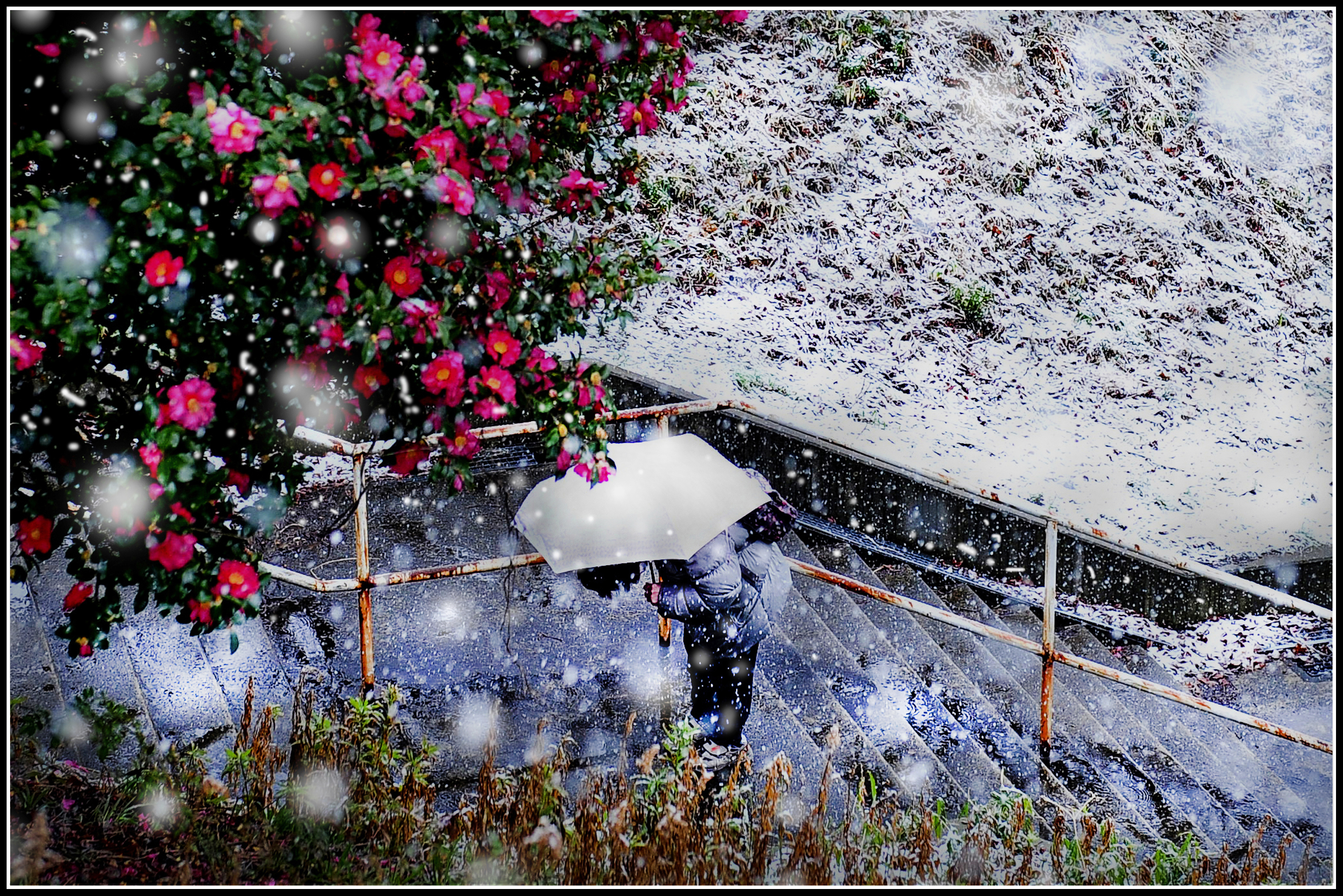重い荷を背負うて急な階段を一歩一歩上がっていく老人。