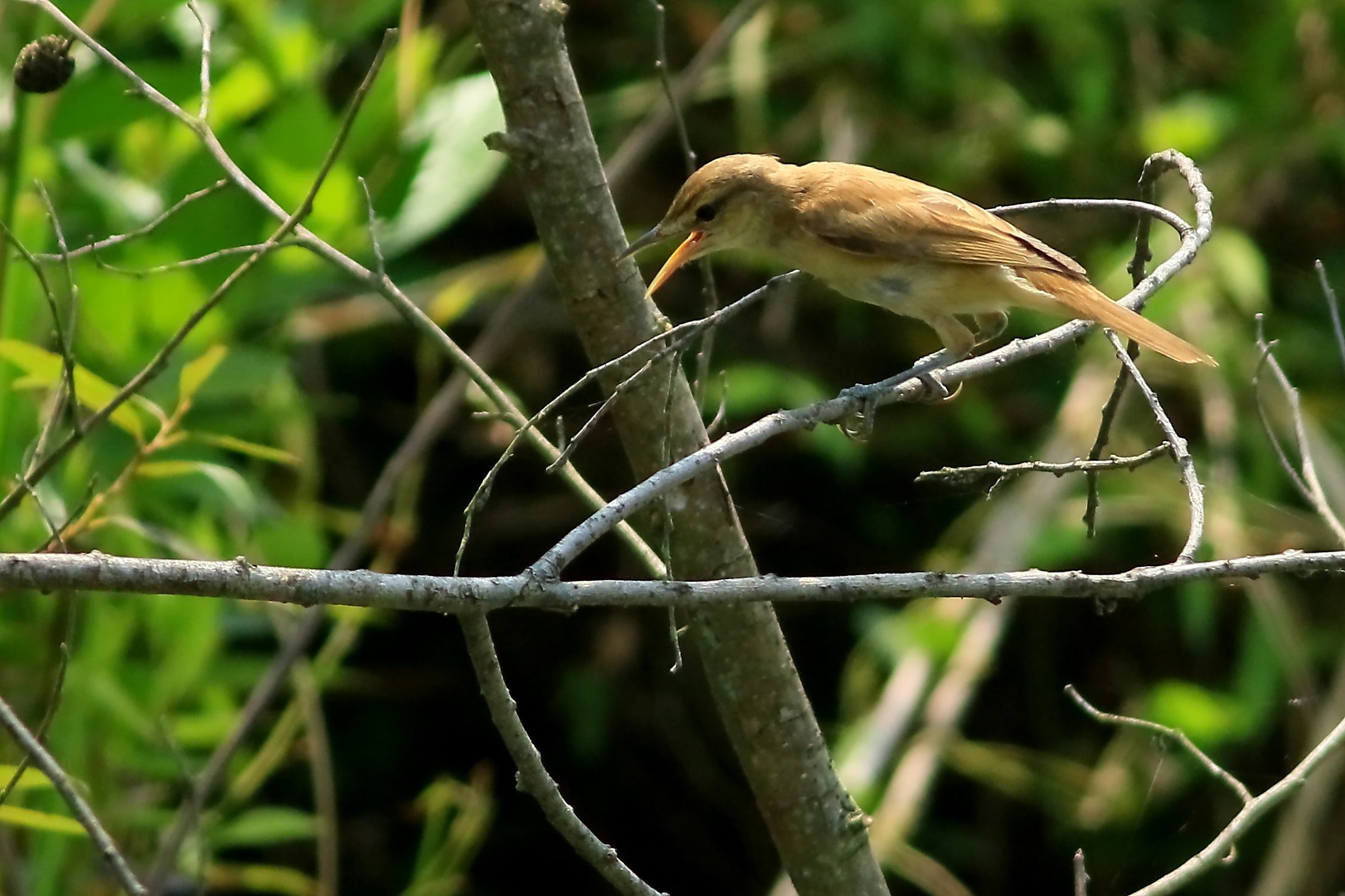 体長18.5㎝(スズメ14.5㎝)の夏鳥。葦の茎等に止まり橙赤色の口の中を見せながら、