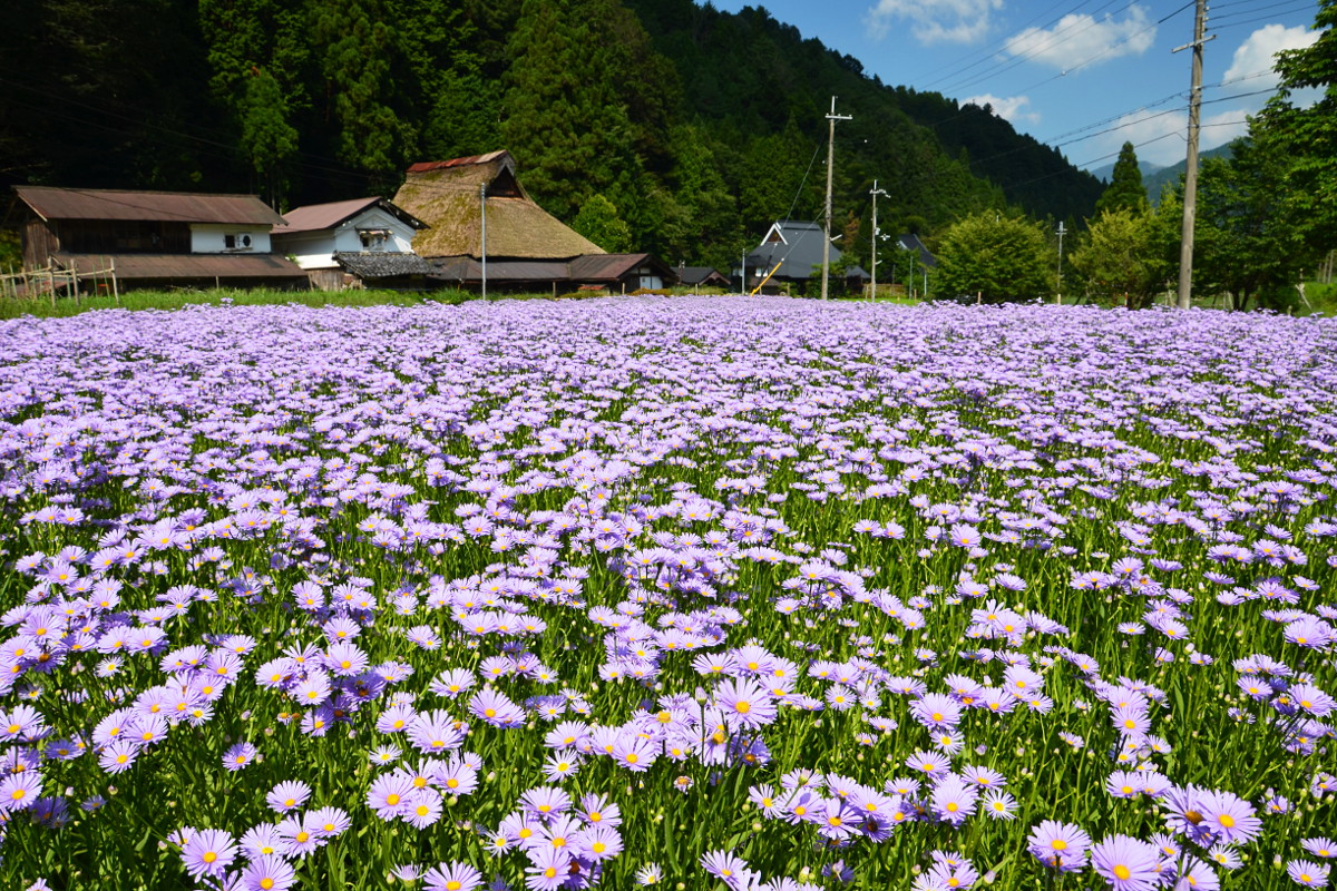 菊のパープルもすがすがしい、かやぶき屋根もあり、