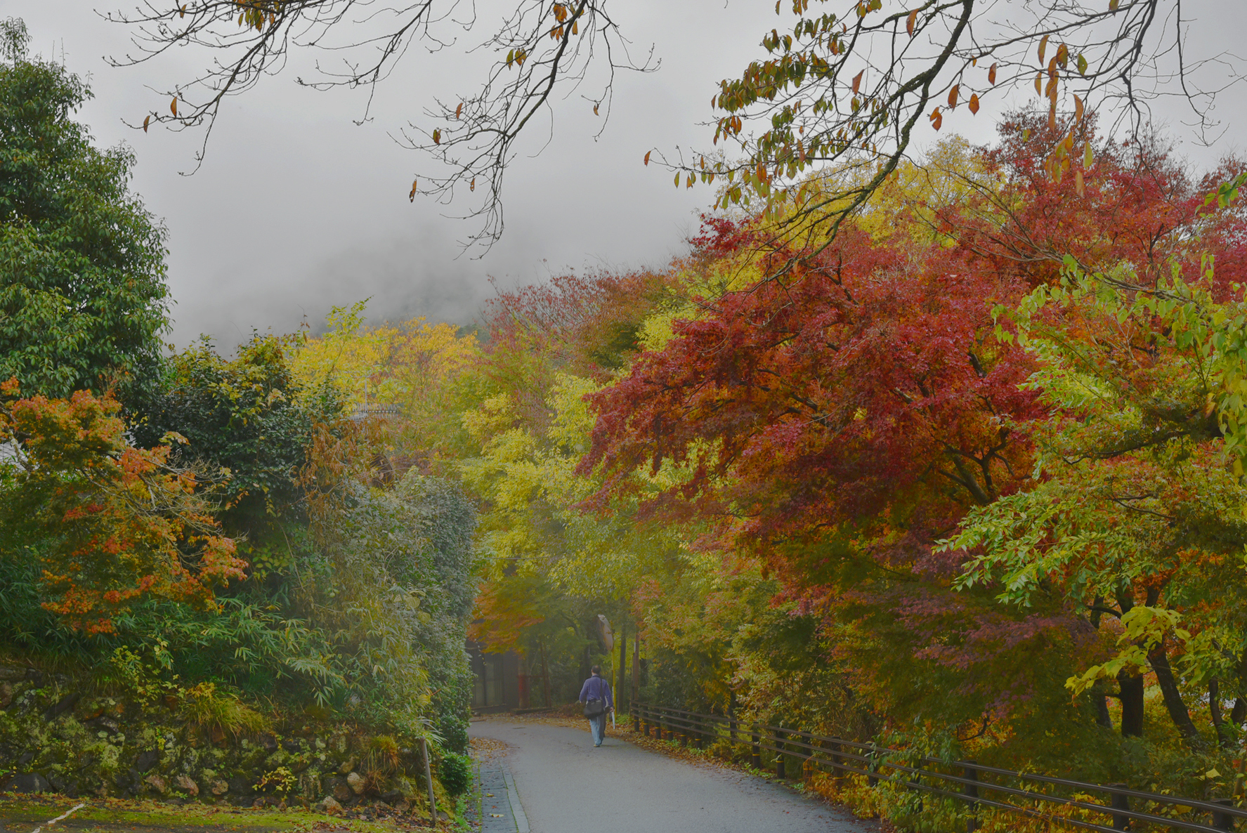往時には薪を頭に載せて京の都で売るために大原女が通った道かと、その姿を紅葉の木々の下想像しながら歩いてみました。折しも、ガスの深く架かる空模様は一層その思いを深めてくれていたようです。