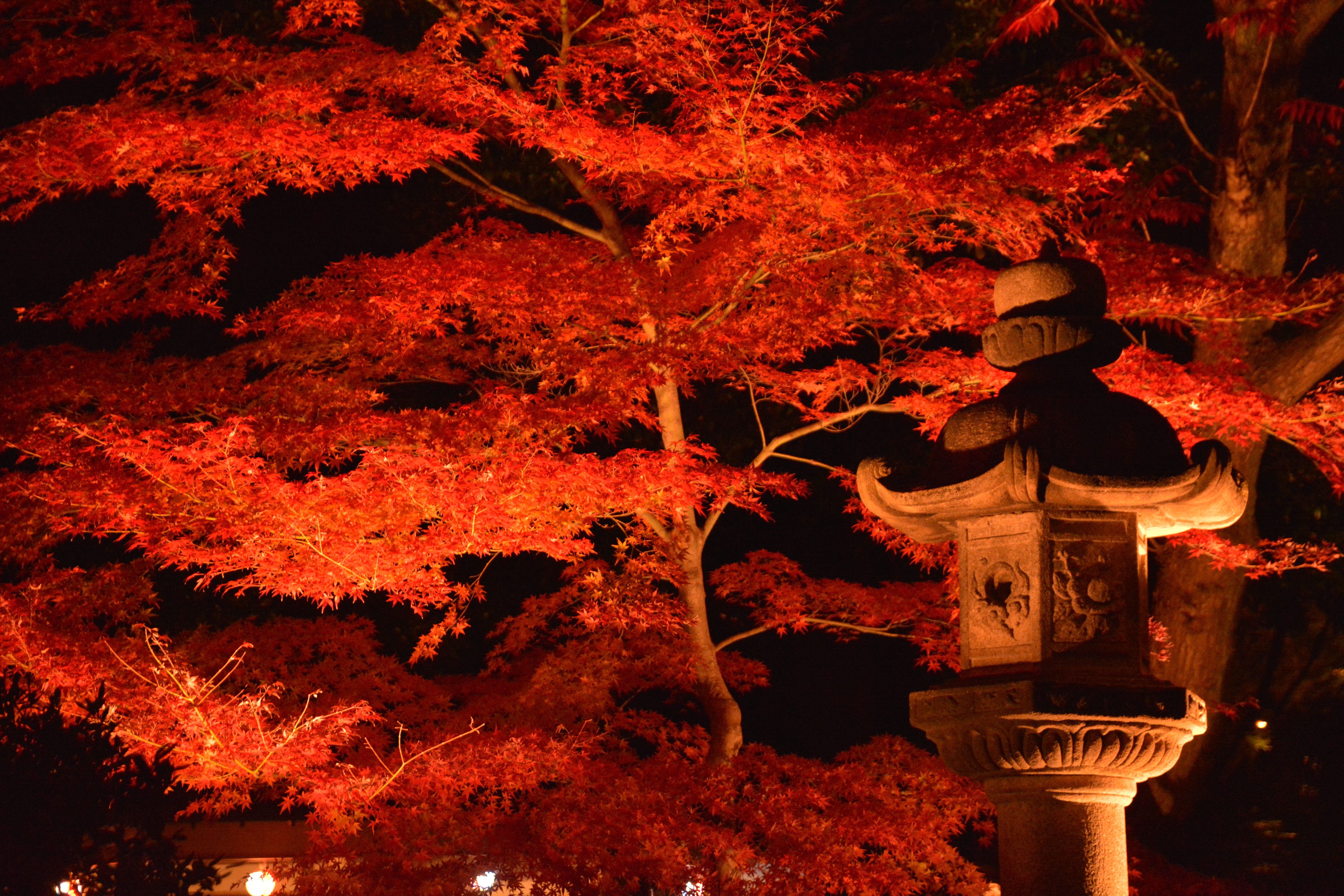 もみじがライトアップされ、手前の灯篭が暗くなってしまうので、それを暗くならないように撮影するのに苦労しました。