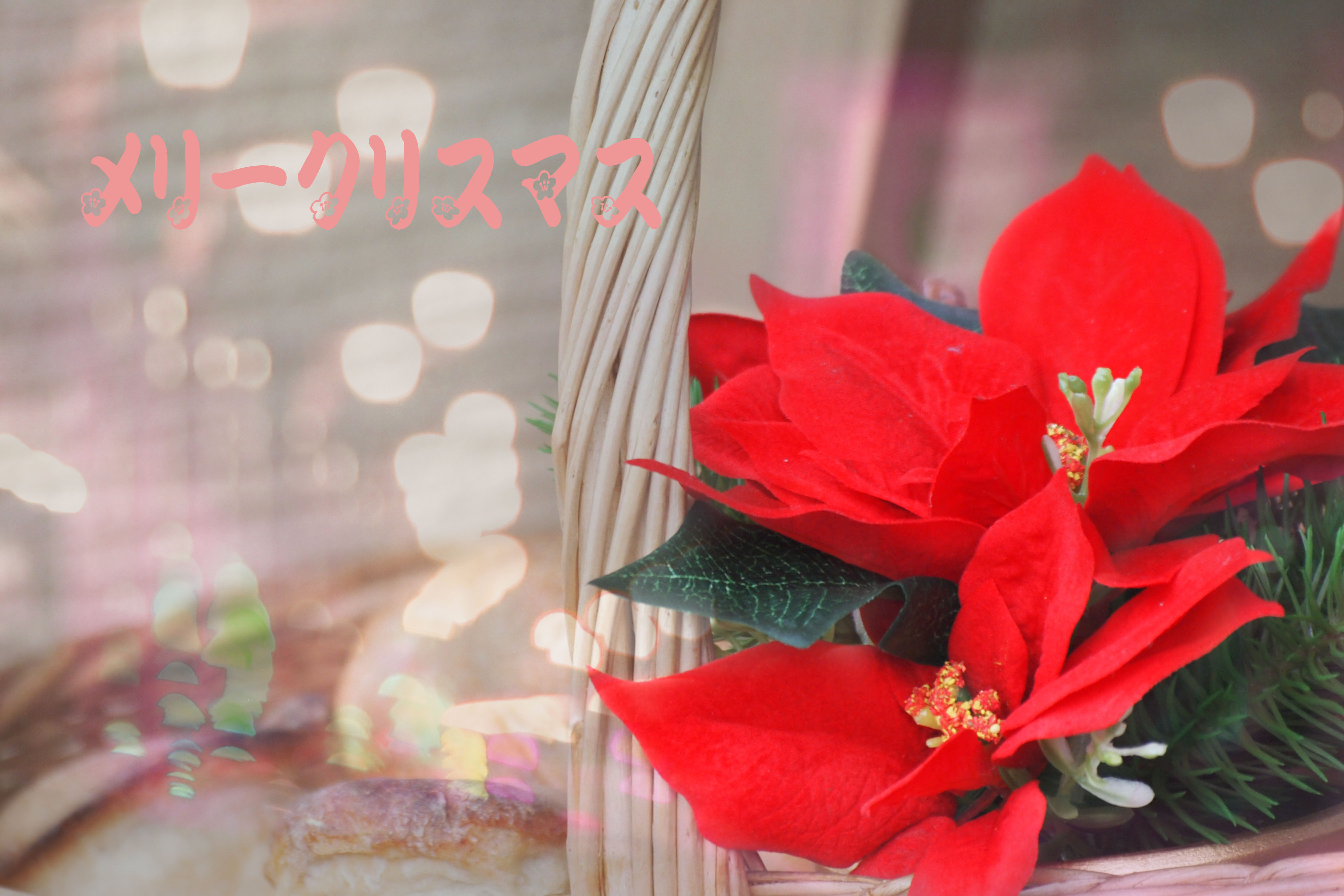 白い玉ボケと赤のポインセチアが華やかな、