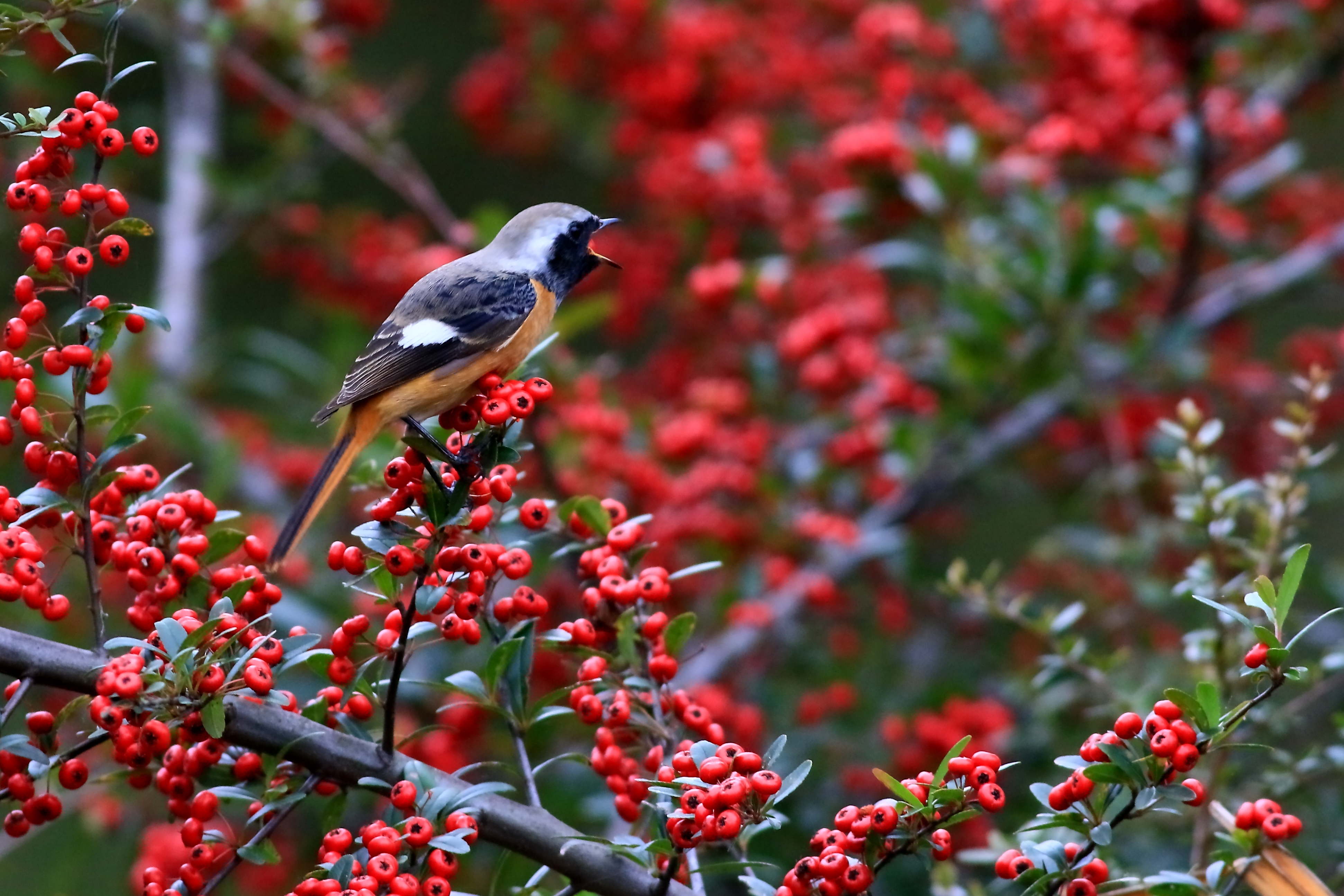 ピラカンサの実の端っこが僅かに口の中に見えます。次作に続きます。 今年は紅い実がびっしり。