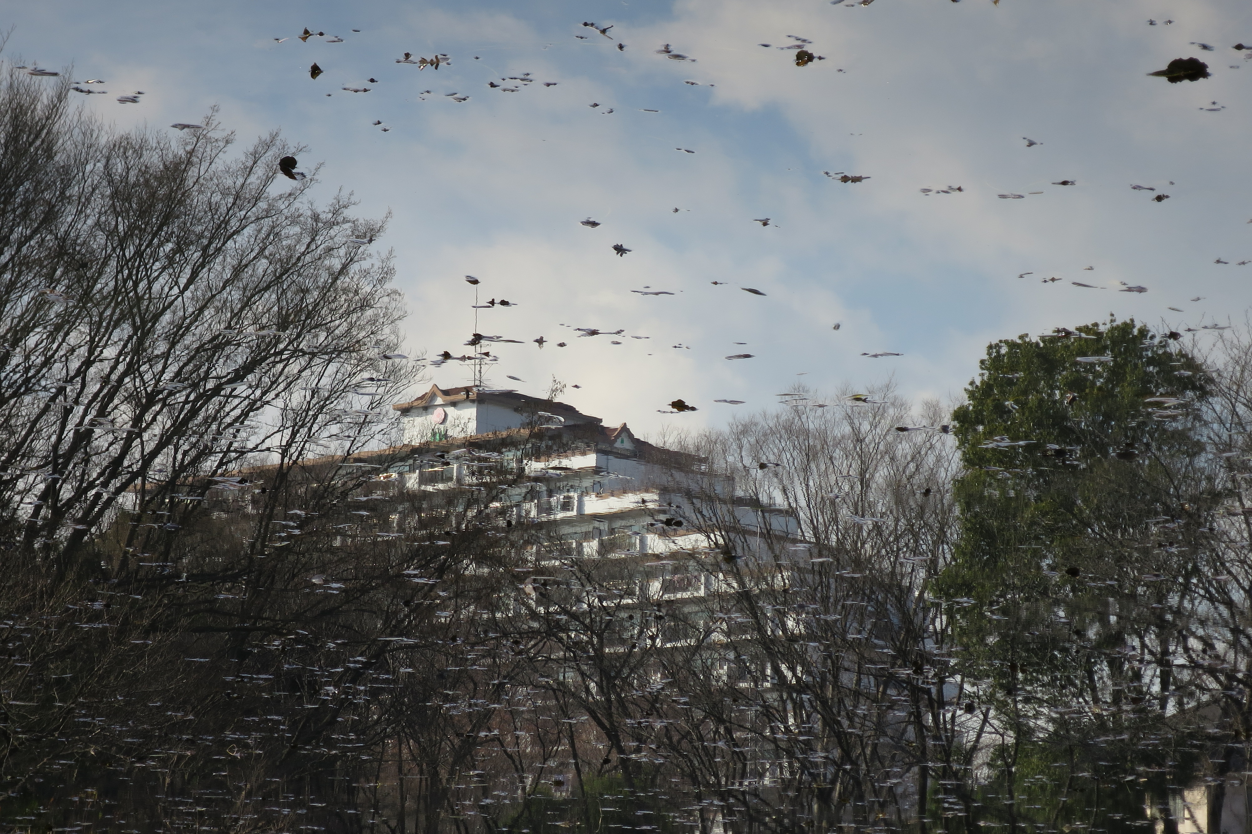 池に映りこんだ森とマンション。摩訶不思議な一枚となりました。