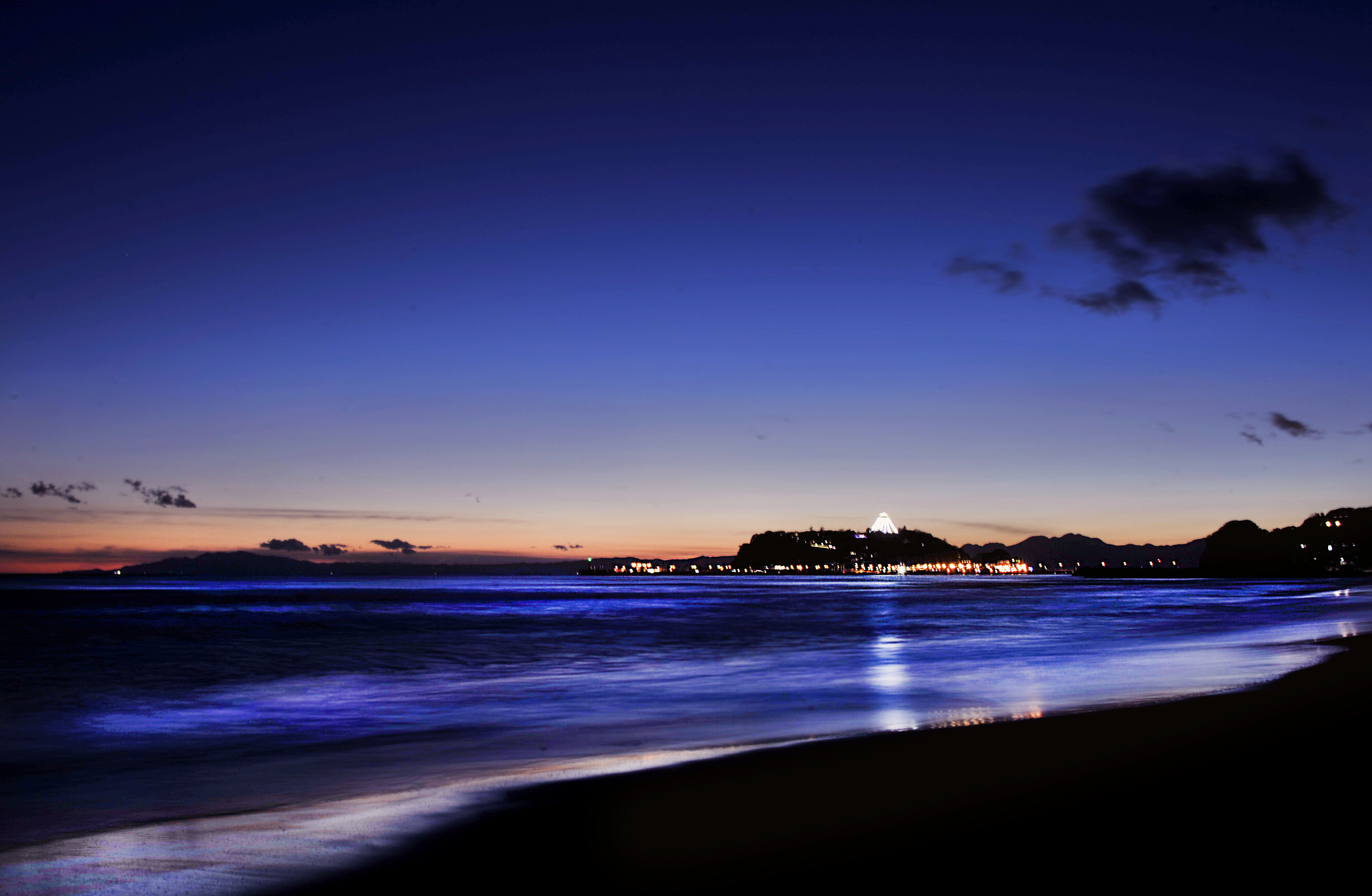 鎌倉七里ヶ浜の暮色 沖に見えるイルミネーションは江ノ島。