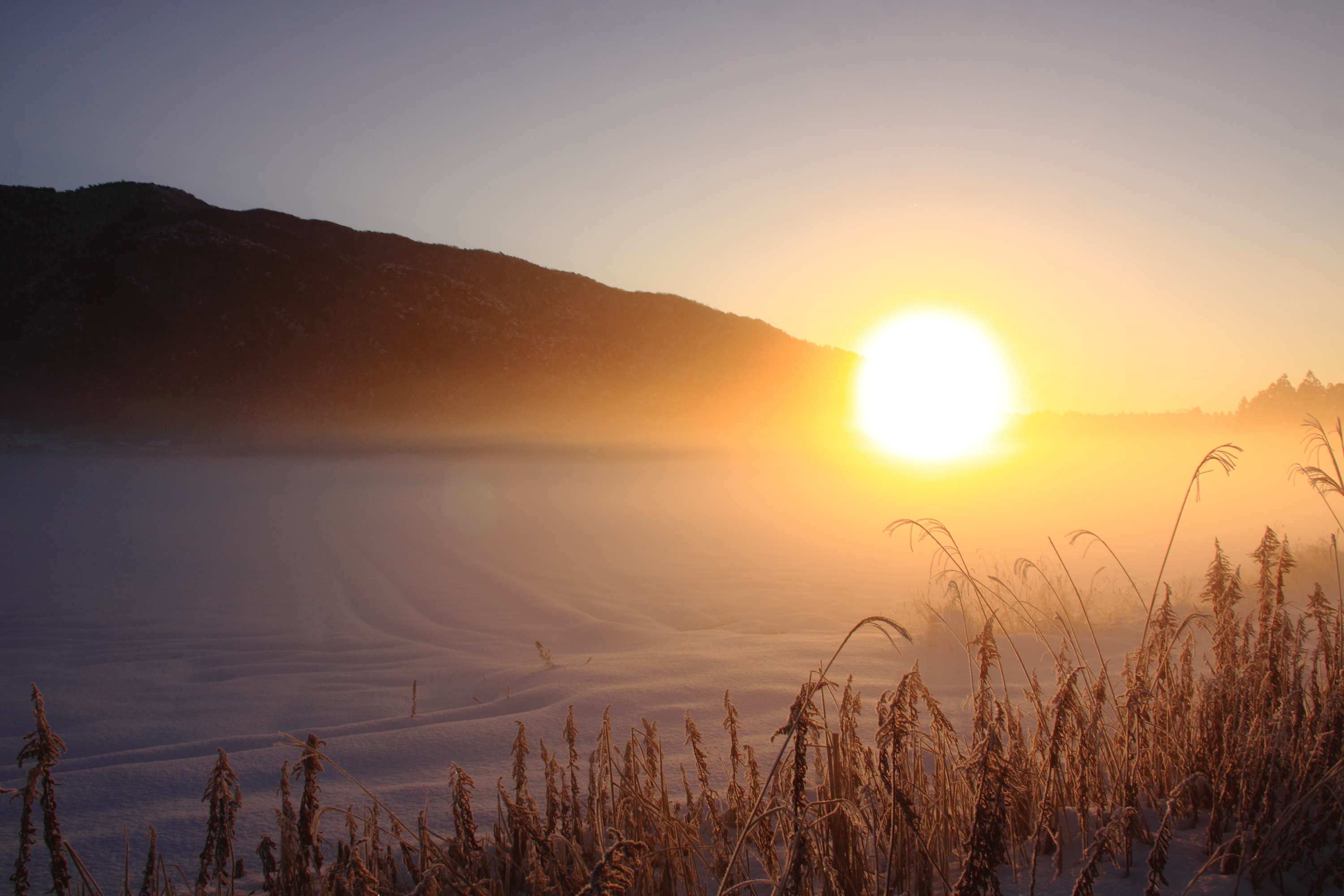 厳しく冷え切った早朝、朝靄がかかり太陽がより大きく見える光景です。