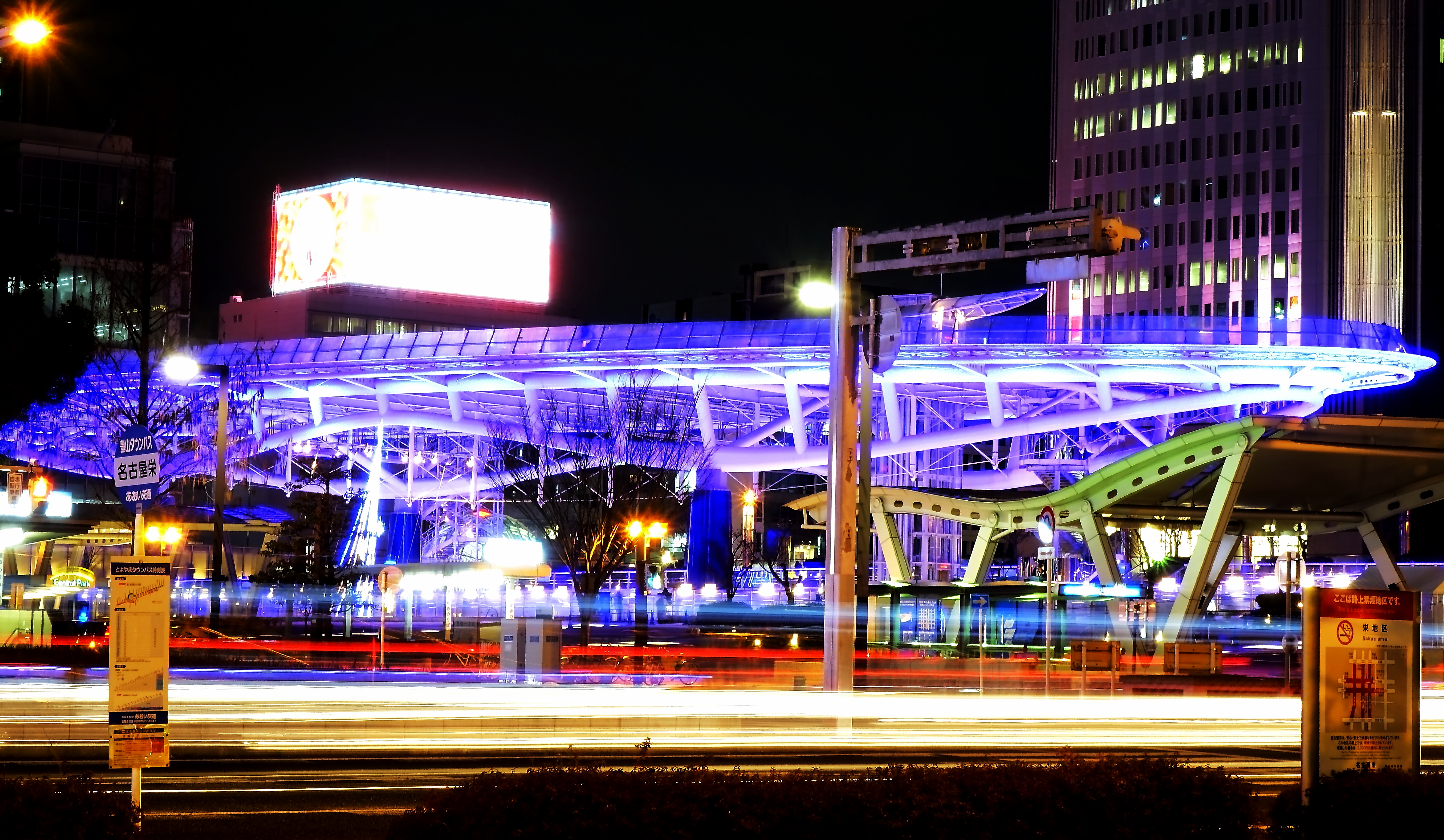 名古屋市栄「オアシス21」の水の宇宙船のライトアップされた姿を長秒露光して撮影しました。