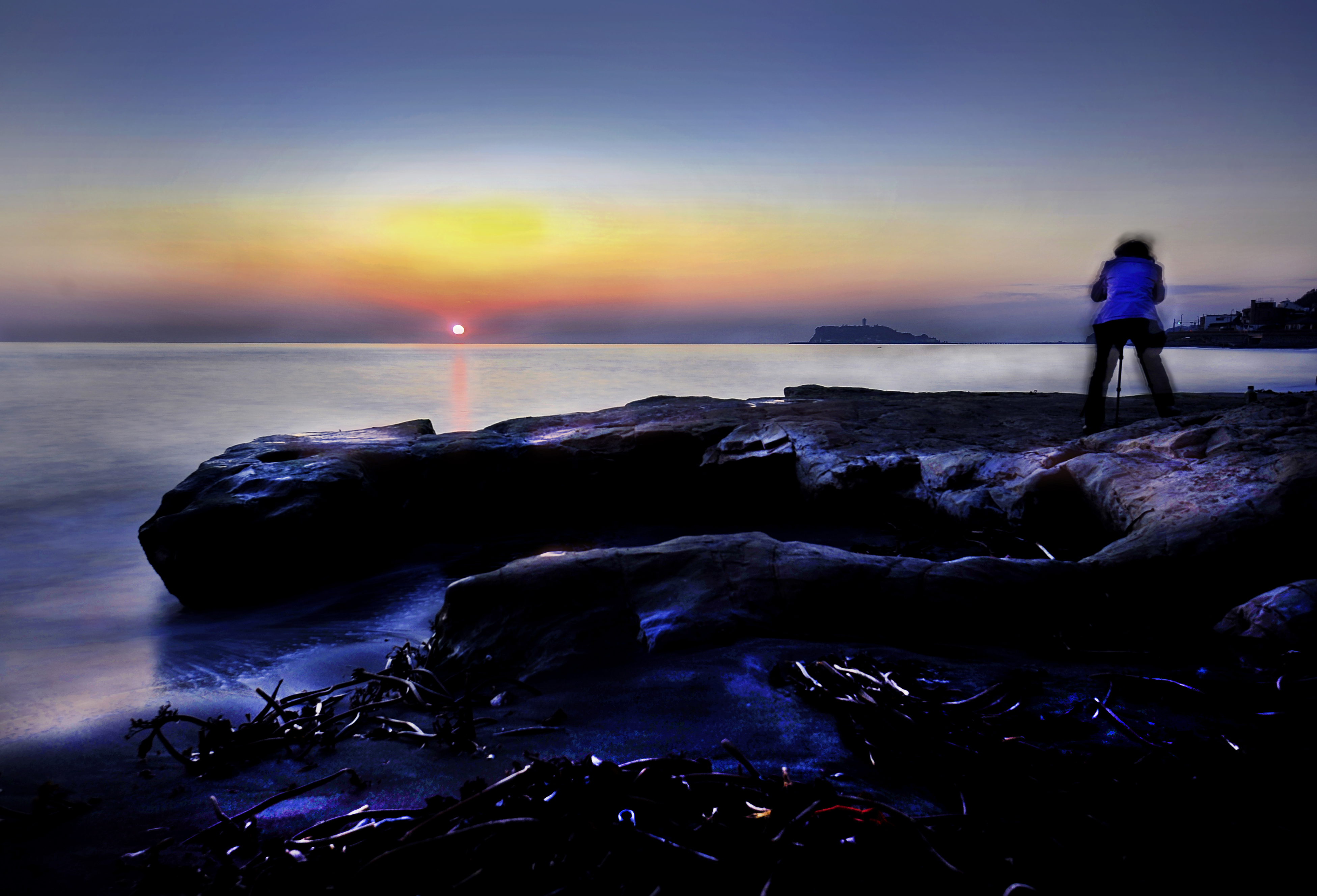 あと30秒ほどで日が水平線に沈む。この一瞬を撮ろうとカメラマンも緊張している様子。