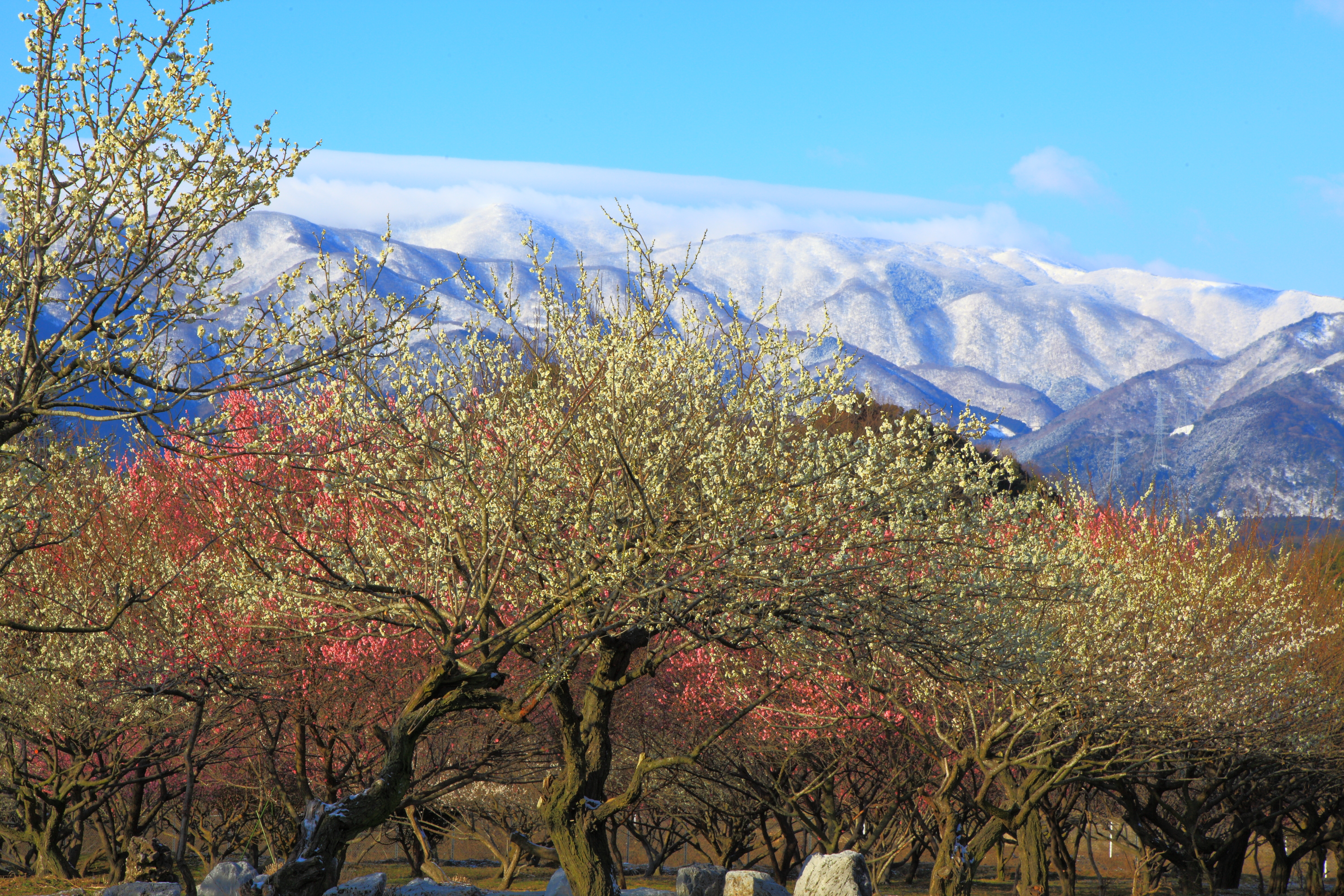 早春の素敵な風景 背景の山並み 梅林の大木 見事です。