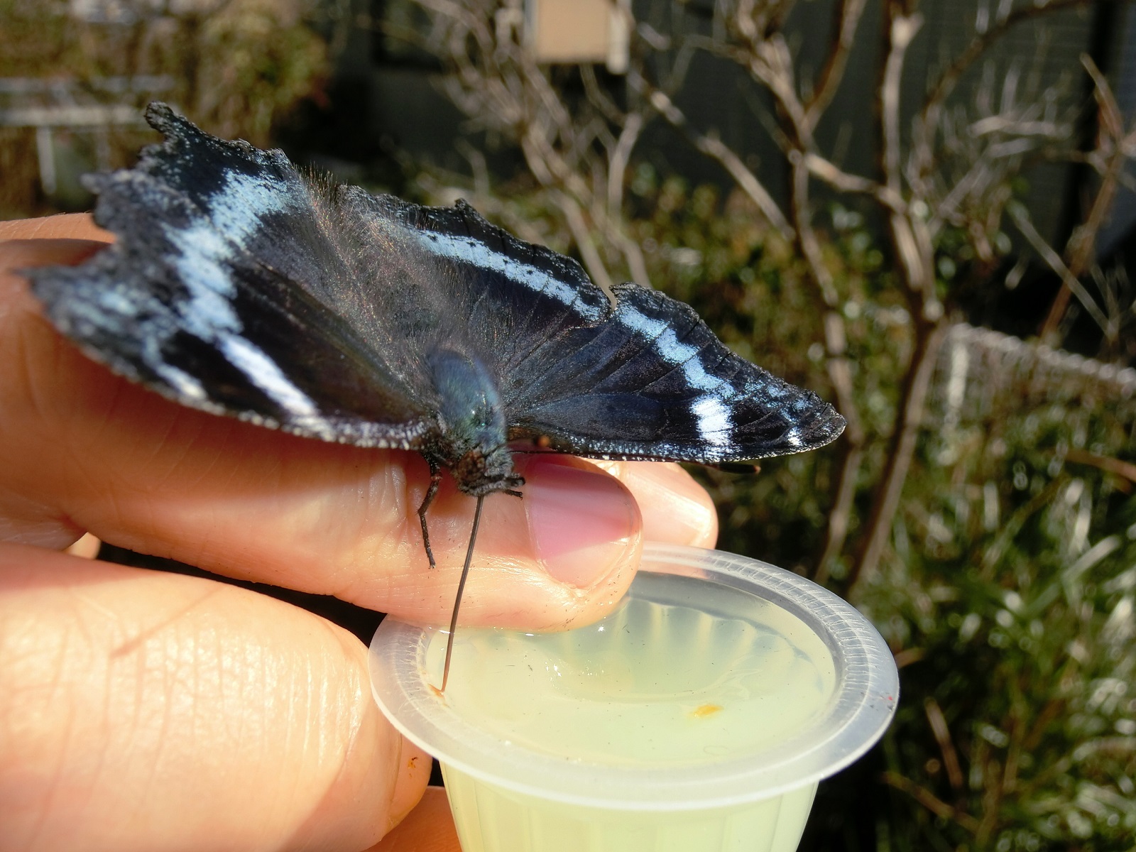 蝶を乗せた左手にゼリーを持たせて、蝶に近づけようとしながら、