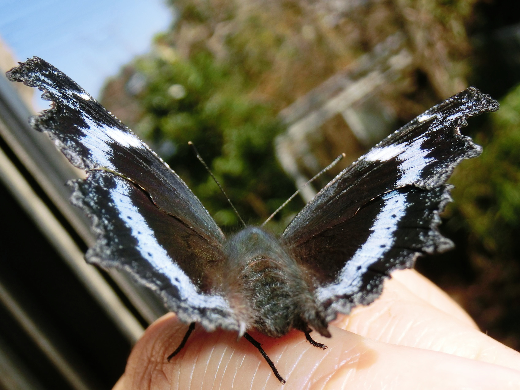 私の手に止まったまま、窓の方を向いている「期待に応えるサバイバー」さん。