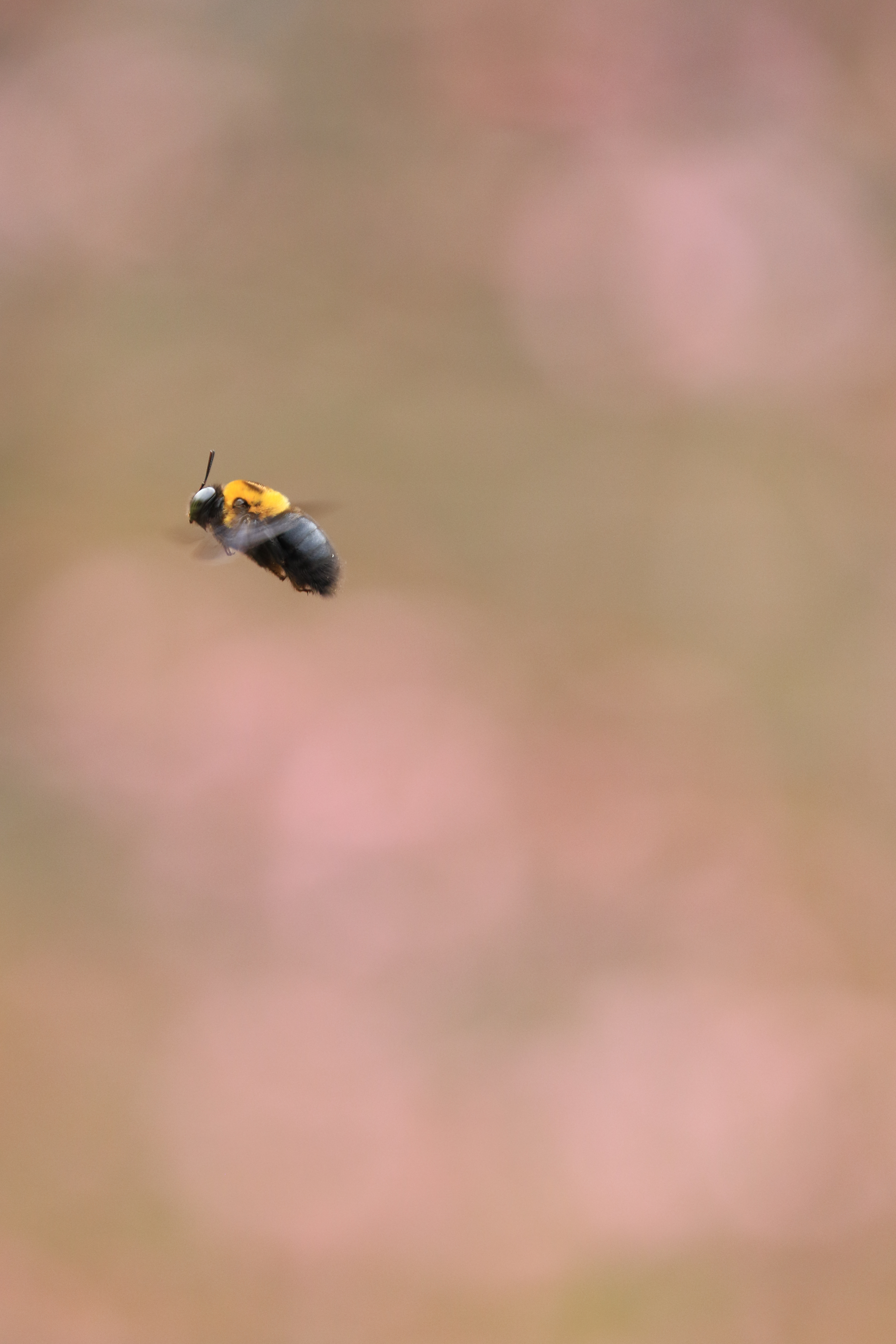 背景の花の暈け味が、蜜を求めて飛ぶくまんばちを