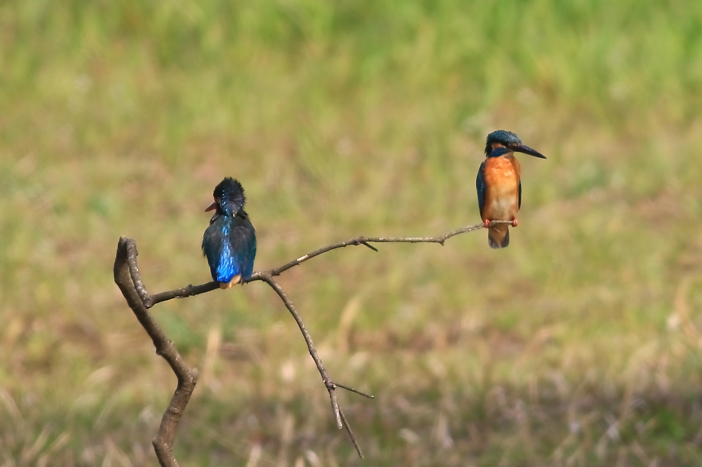 止まり木で待つ雌のカワセミ(左)を目がけて勢いよく飛んで来た雄ですが、まだ親しくなれず