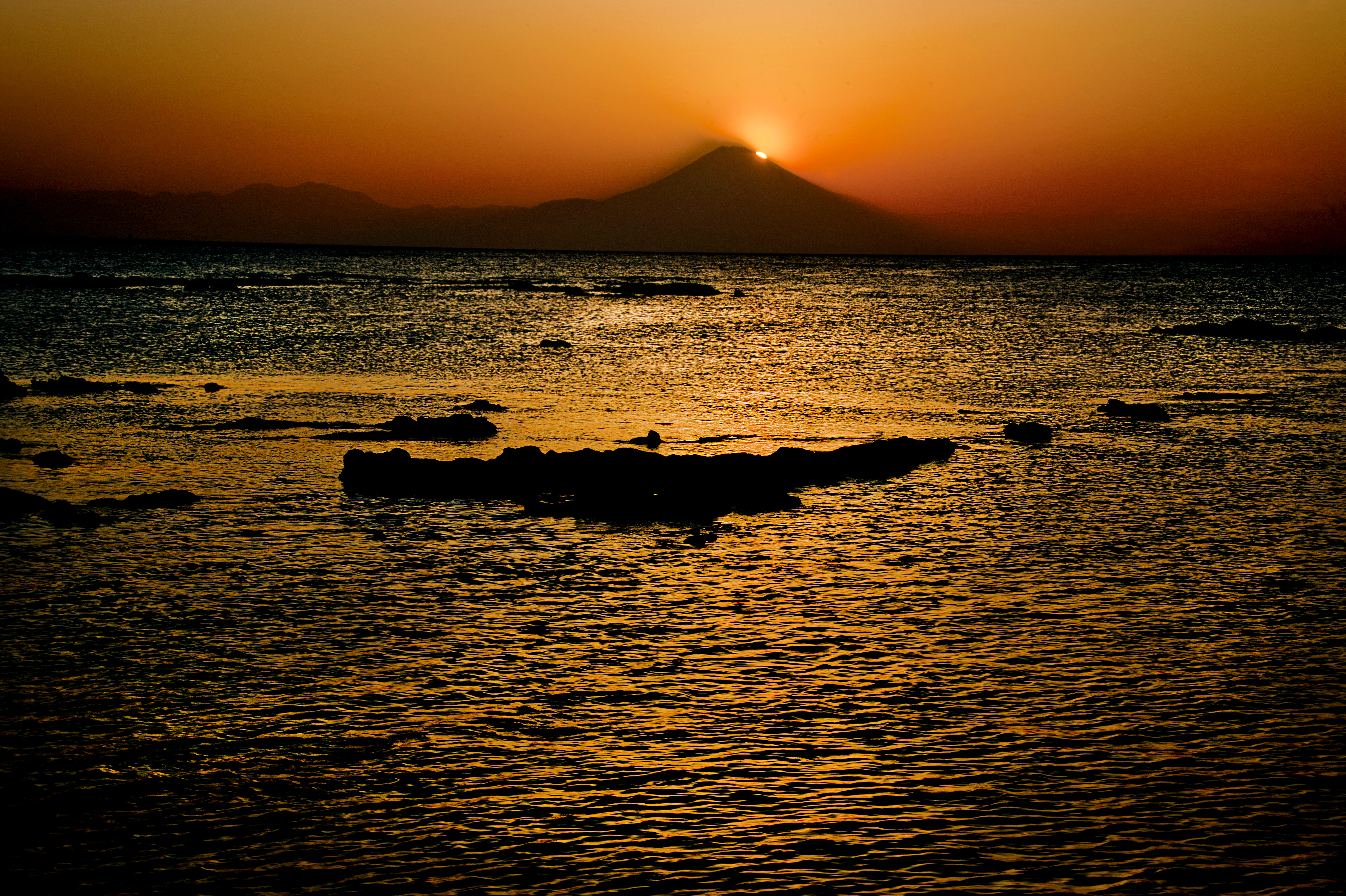 三浦の小田和湾の夕暮れ ダイヤモンド富士を狙ったのですが、ちょっと外れてしまいました。