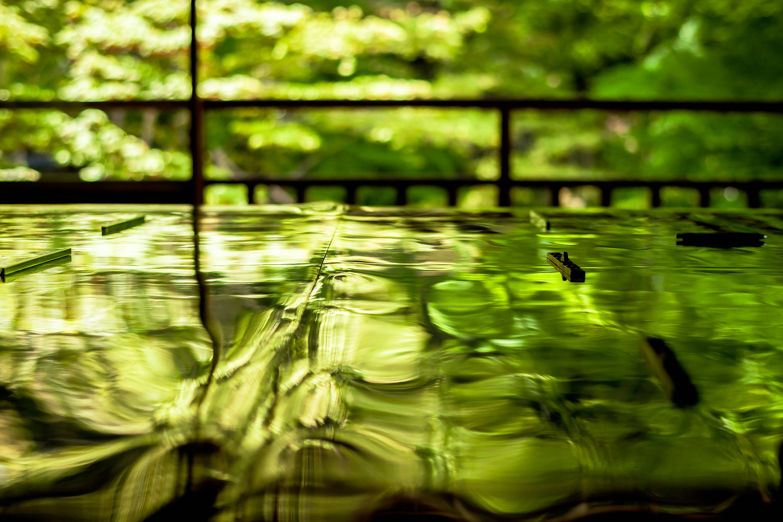 写経用に置かれたテーブルの上のシートに映り込んだ優しい緑の揺らぎ。