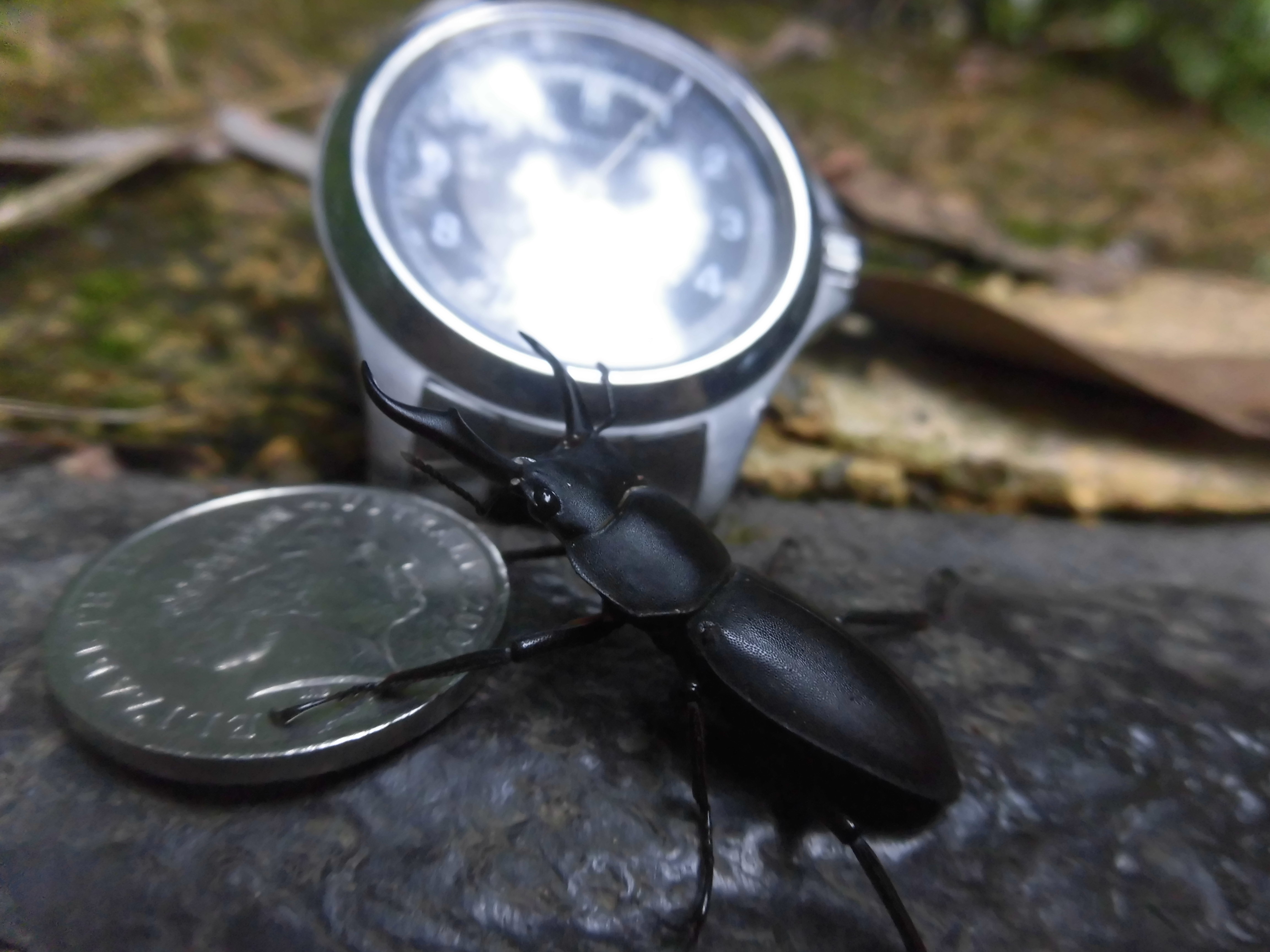 2016年9月12月曜日曇り石川県能美市長滝町「七つ滝」第2の滝階段でエリザベス女王対クワガタの時間無制限の試合がおこなわれた。コイン(エリザベス女王の銀貨)を倒して勝ったのは七つ滝に住むミヤマクワガタ、、、、おめでとう