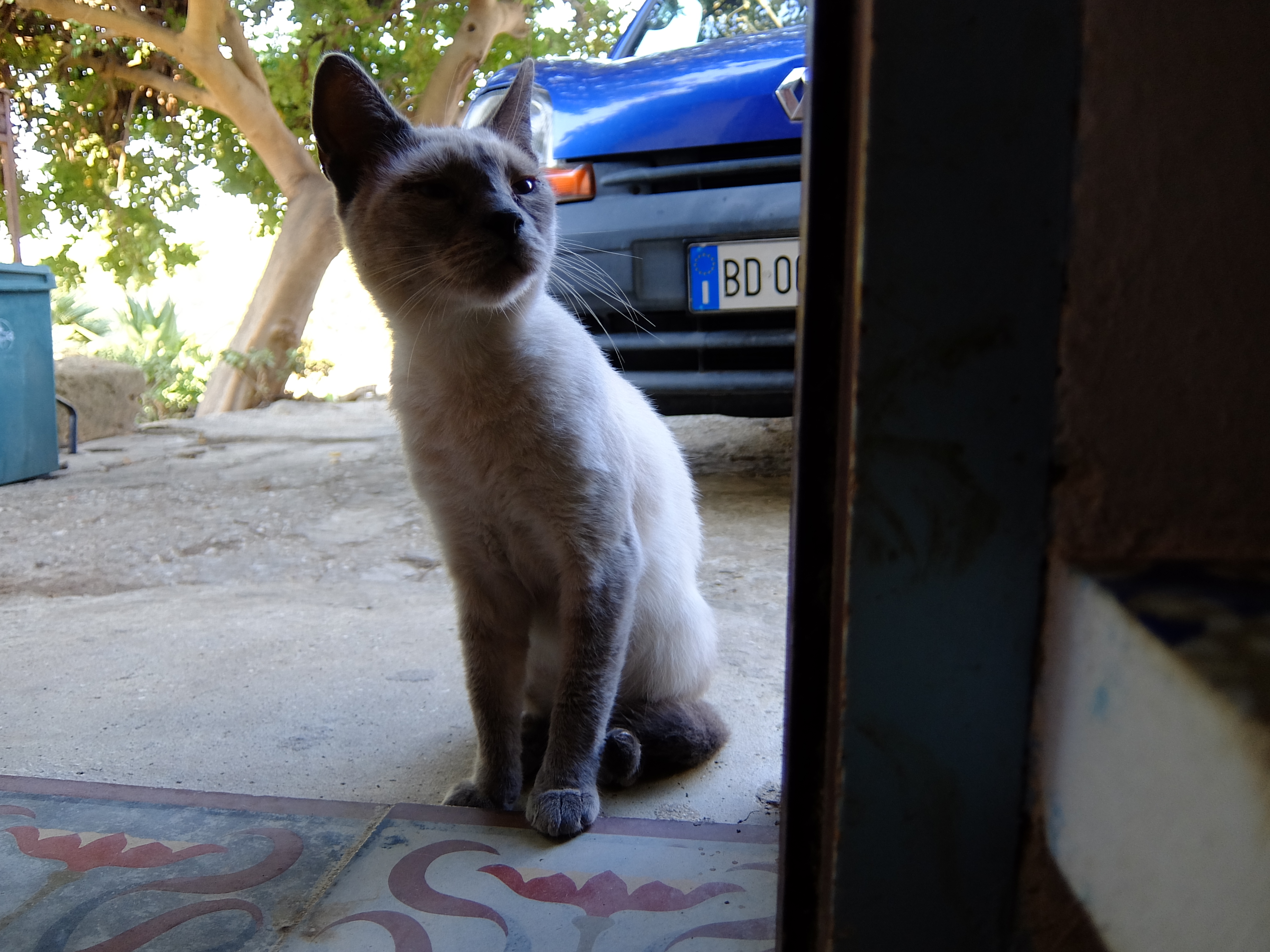 わが家に近づくようになった半・野良猫。昨夏まで近くに住んでいた女性が面倒をみていた半・野良猫20匹のうちの1匹。彼女が引っ越してから、多くのネコたちが去りましたが、このネコを含め、3、4匹は、しぶとく残って生活しています。わが家に3匹のイヌがいることを知っているので、容易には近づきません。だけど、ひと恋しいのでしょう、おなかが空くのでしょう。こうやって、玄関にやってきます。主人が、クルマ(後ろに見えるカングー)の窓を閉め忘れていると、車内で寝ています。