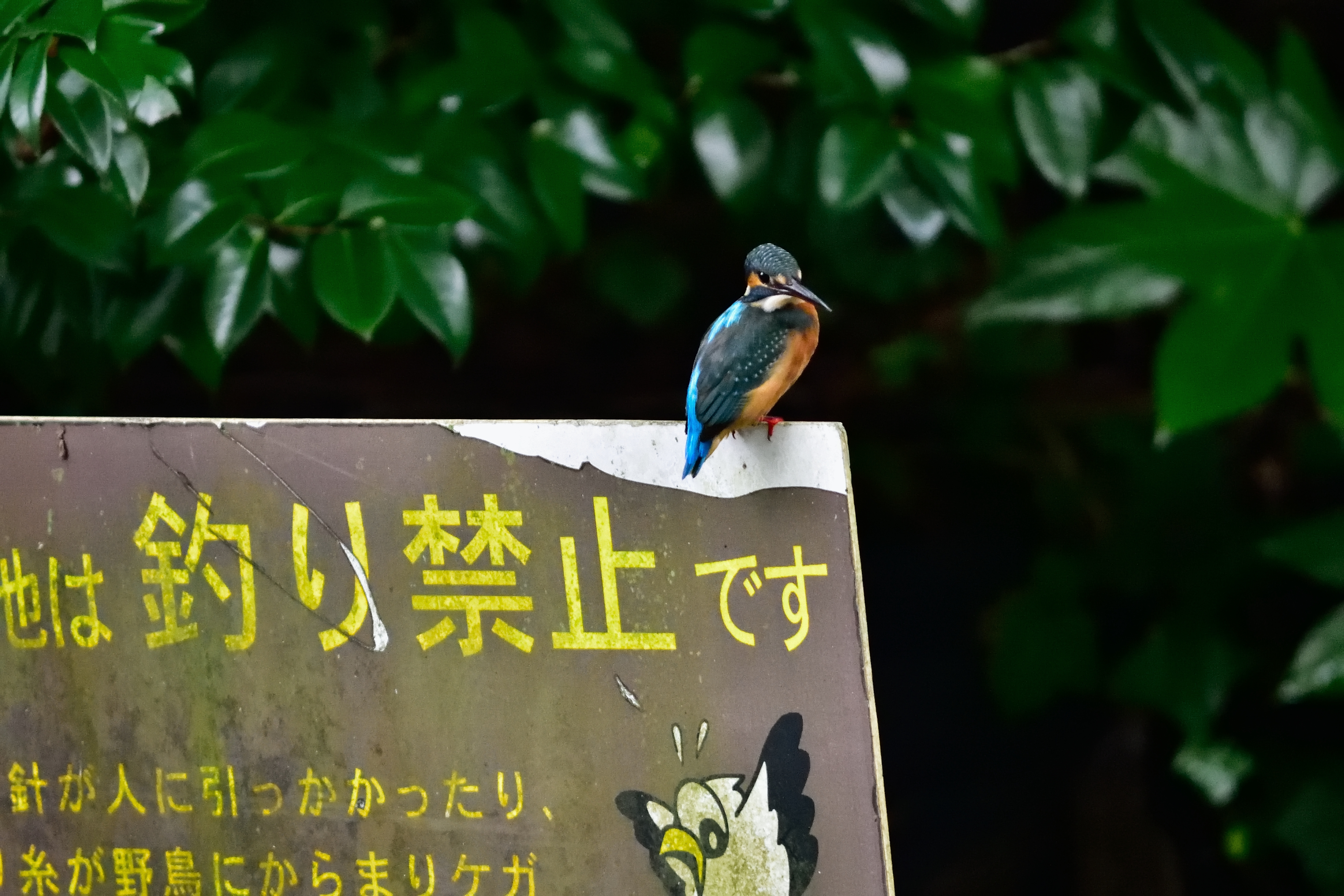 近所の公園にてカワセミが看板の上で、「皆さんルールを守りましょう」と言っているみたいですね。