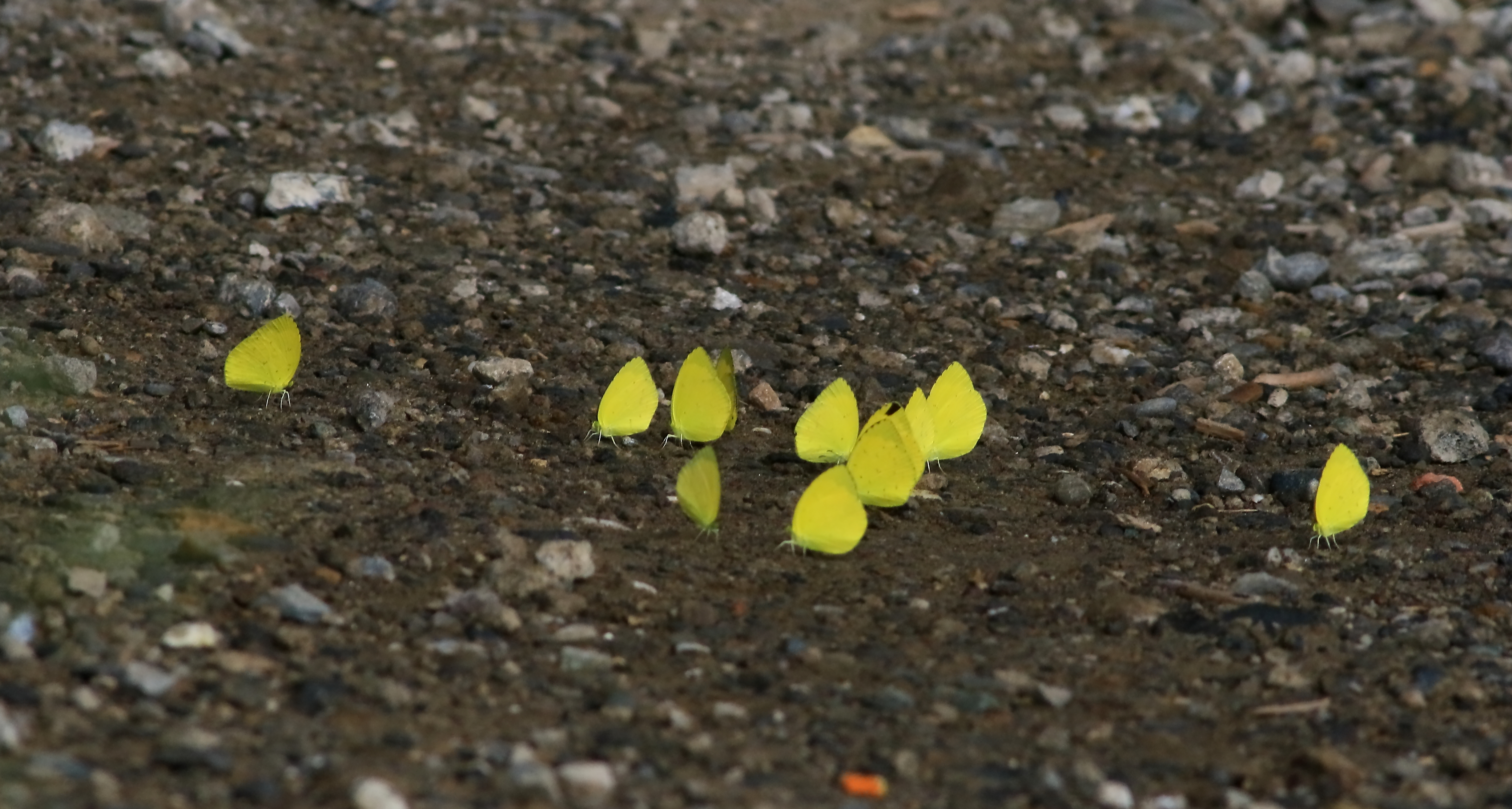 こんな砂利道の真ん中に黄色い蝶が10匹も集まっていました。初めて見る光景です。