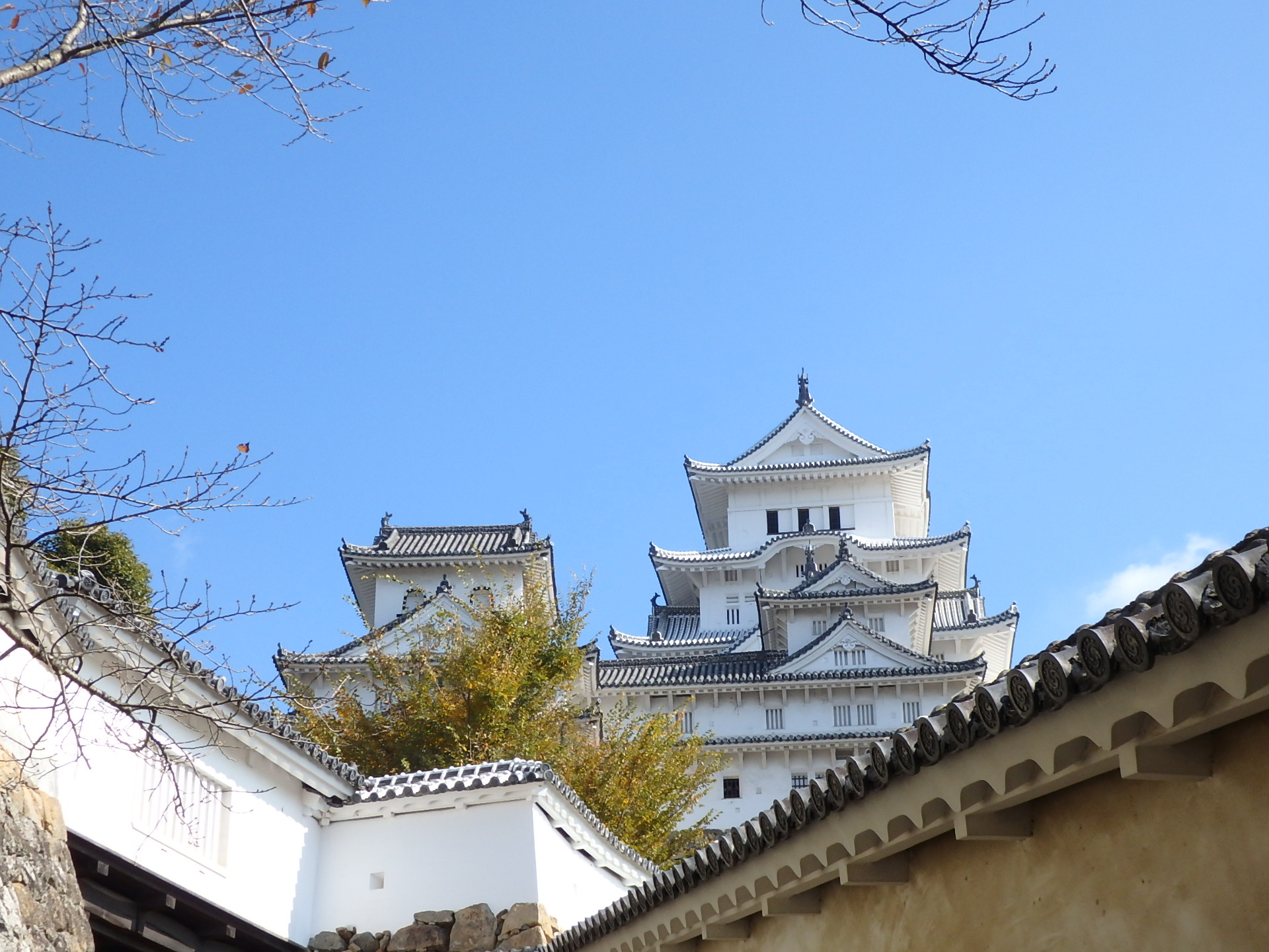 城郭の階段から撮った天守閣である。天守閣の大きさが引き立ち、圧巻である。