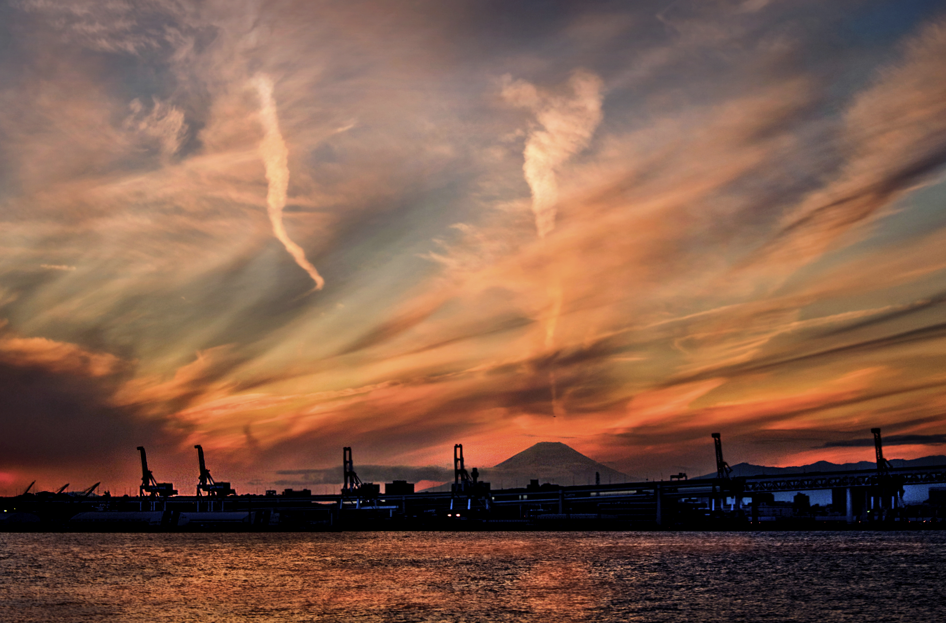 横浜本牧ふ頭の夕暮れ 遠くに富士山が見える。