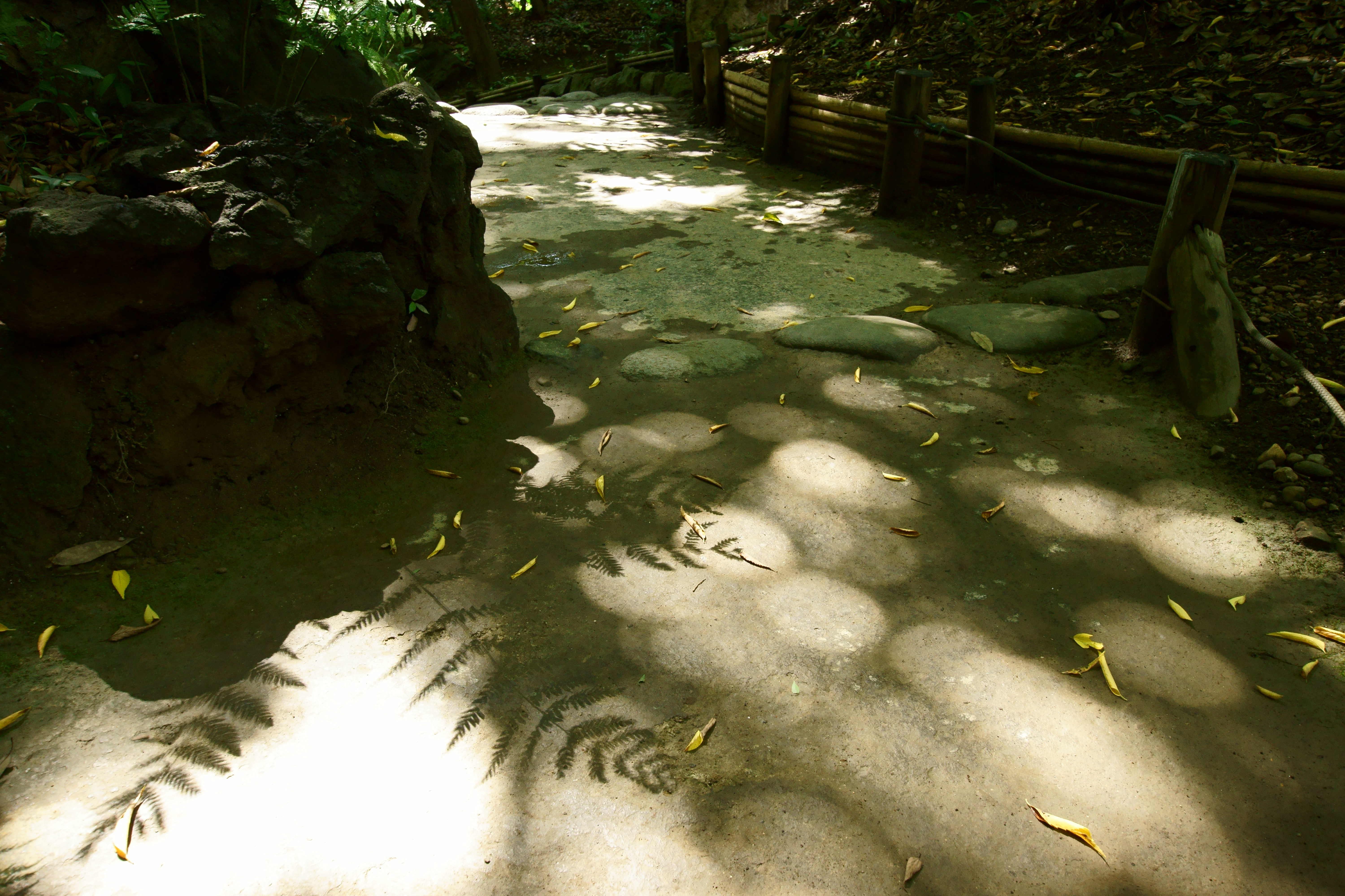 小石川後楽園の園内遊歩道にシダの影と木漏れ日が玉ボケになって、目を楽しませてくれました。