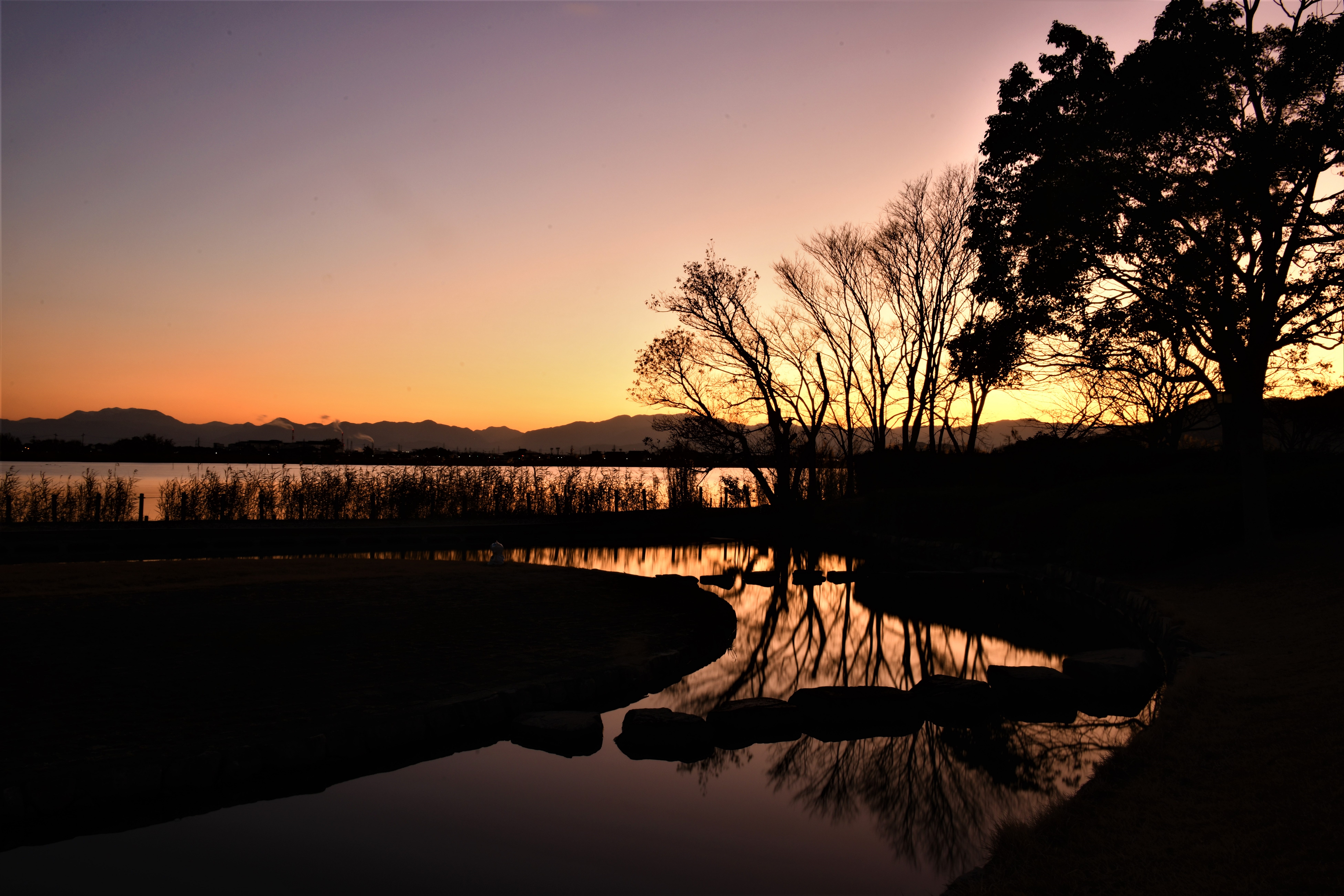 人工池に樹のシルエットが映り込んでました。