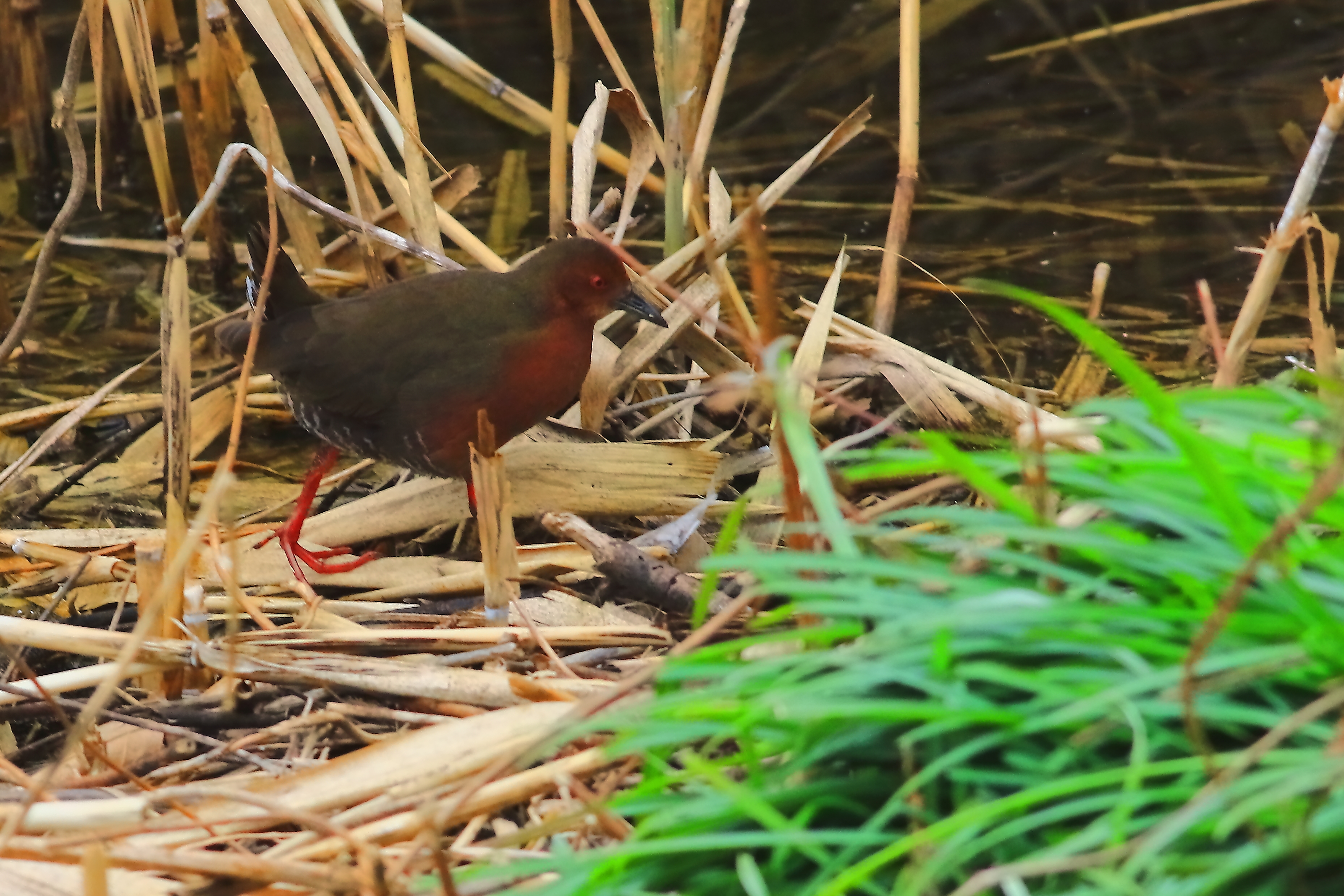 この時期湿地の葦の茂みや水田に生息、めったに姿を見せないヒクイナ。急ぎ足で緑の前を通り過ぎて