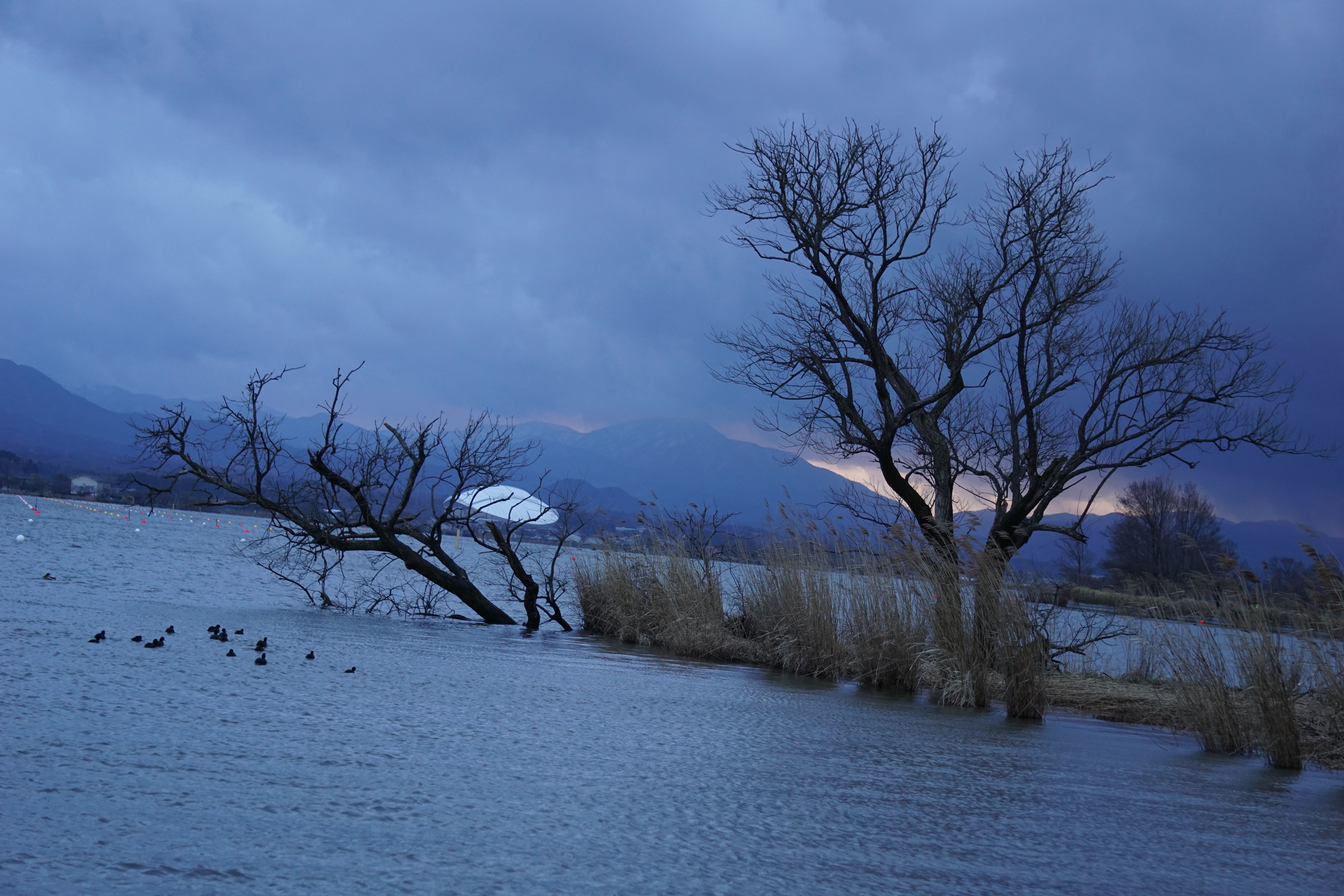 その日は一日中「雨」、それも100%、チャンスを待つしかない、半分以上諦めていた、、、、しかし一枚だけ「チャンス」があるかもしれない、夕暮れの「5時24分」雨が上がる、そうこの一枚に全てをかける!そして、魔法の時間帯(マジックアワー)を狙う、湖面がブルー青色に変わる、ブルーアワーを狙う、一枚撮れた、予測どおりその後、雨が降ってきた、まもなく、雷(かみなり)、霰(あられ)、春の嵐到来、後は寝るだけ、一日待ち、写真投稿。