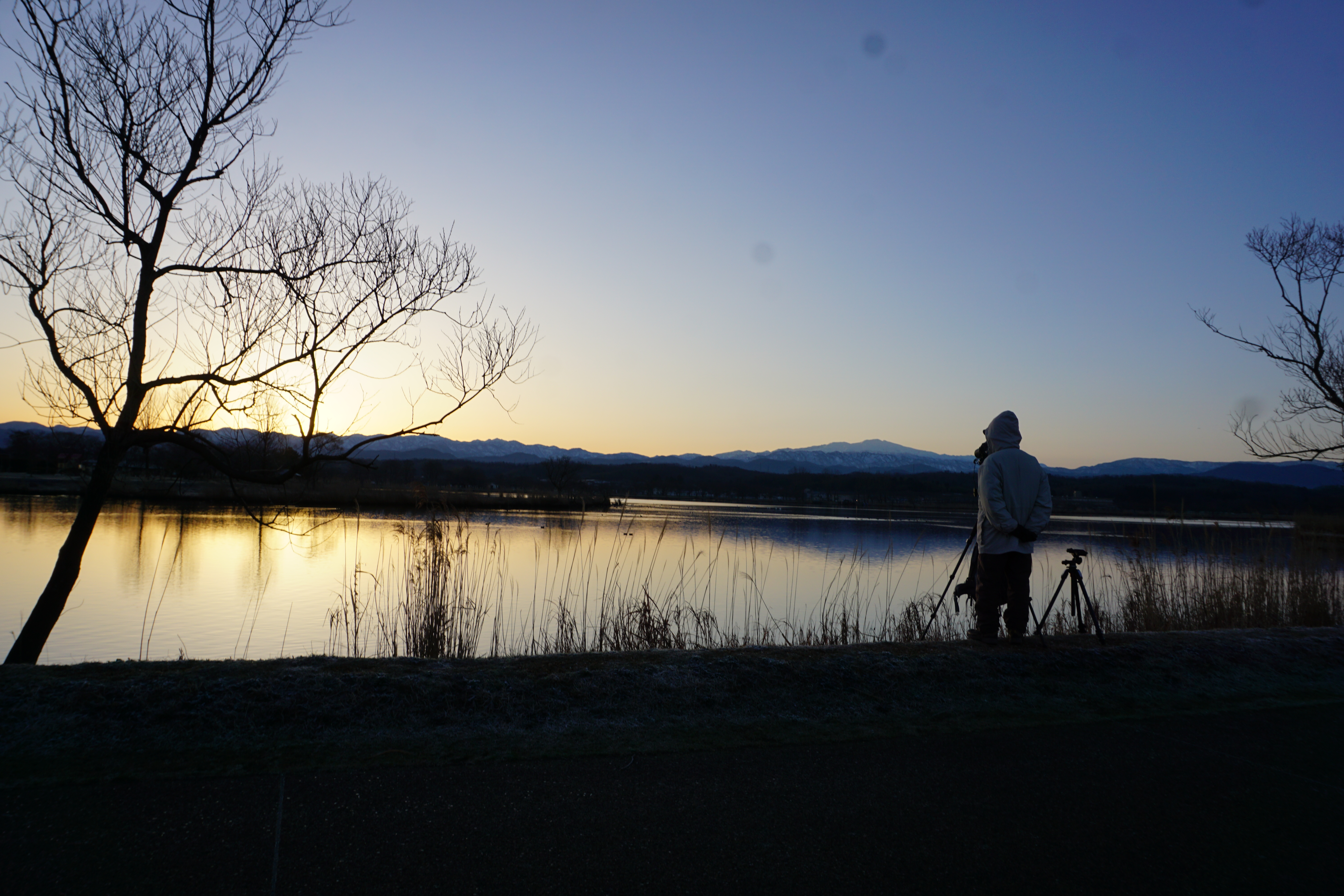 夜明けに写真家が湖のほとりで写真を撮っています。