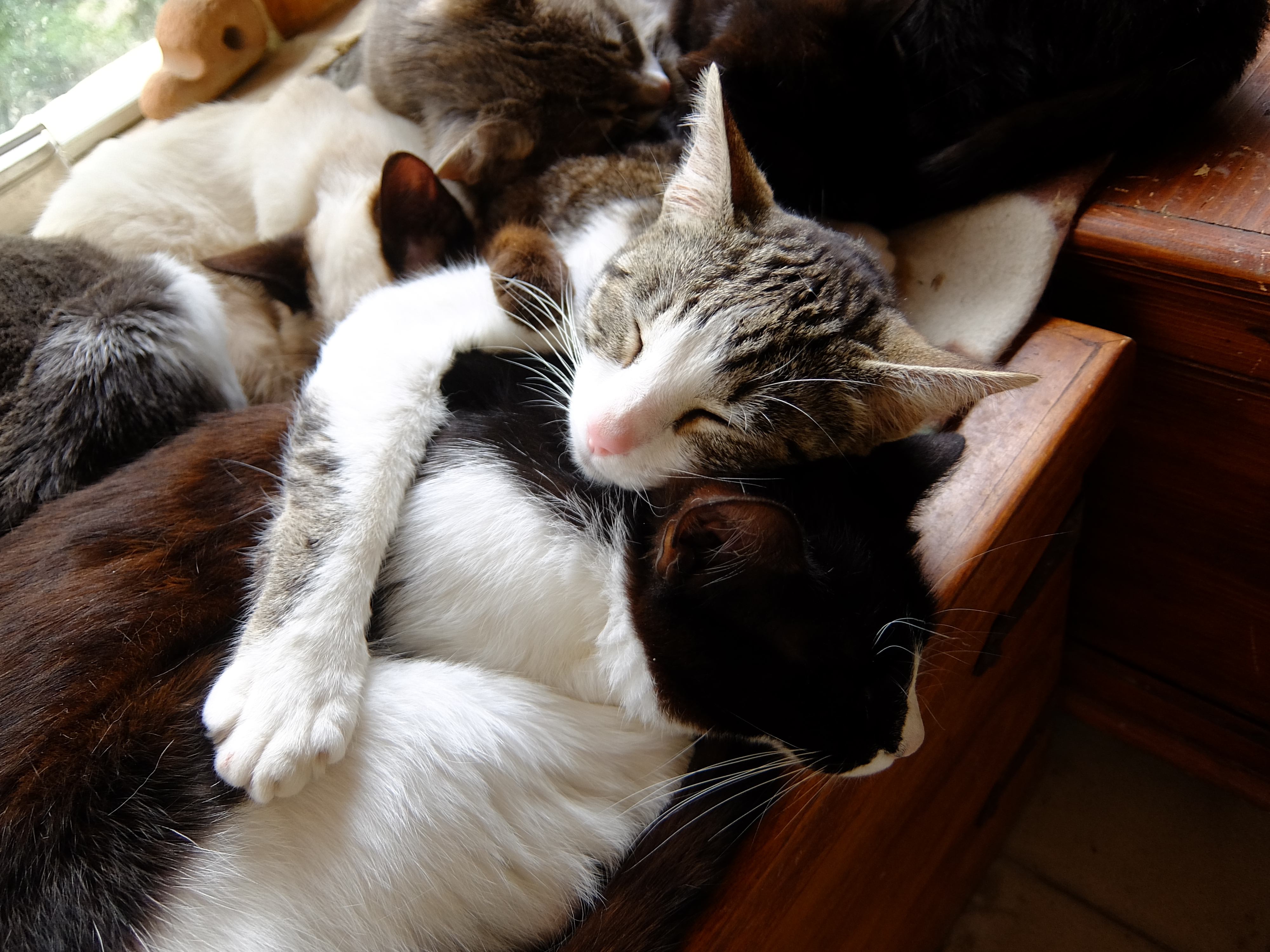 時速50Kmを超える強風が吹き荒れる、イースターマンデーのきょう(2019年4月22日)。午後には雷が鳴り出しました。でも、猫ファミリーは平和です。ハリー(虎模様のほう)は妹・ウッシーに寄り添って、気持ちよさそうに寝ています。彼らは、4月27日で満一才です。