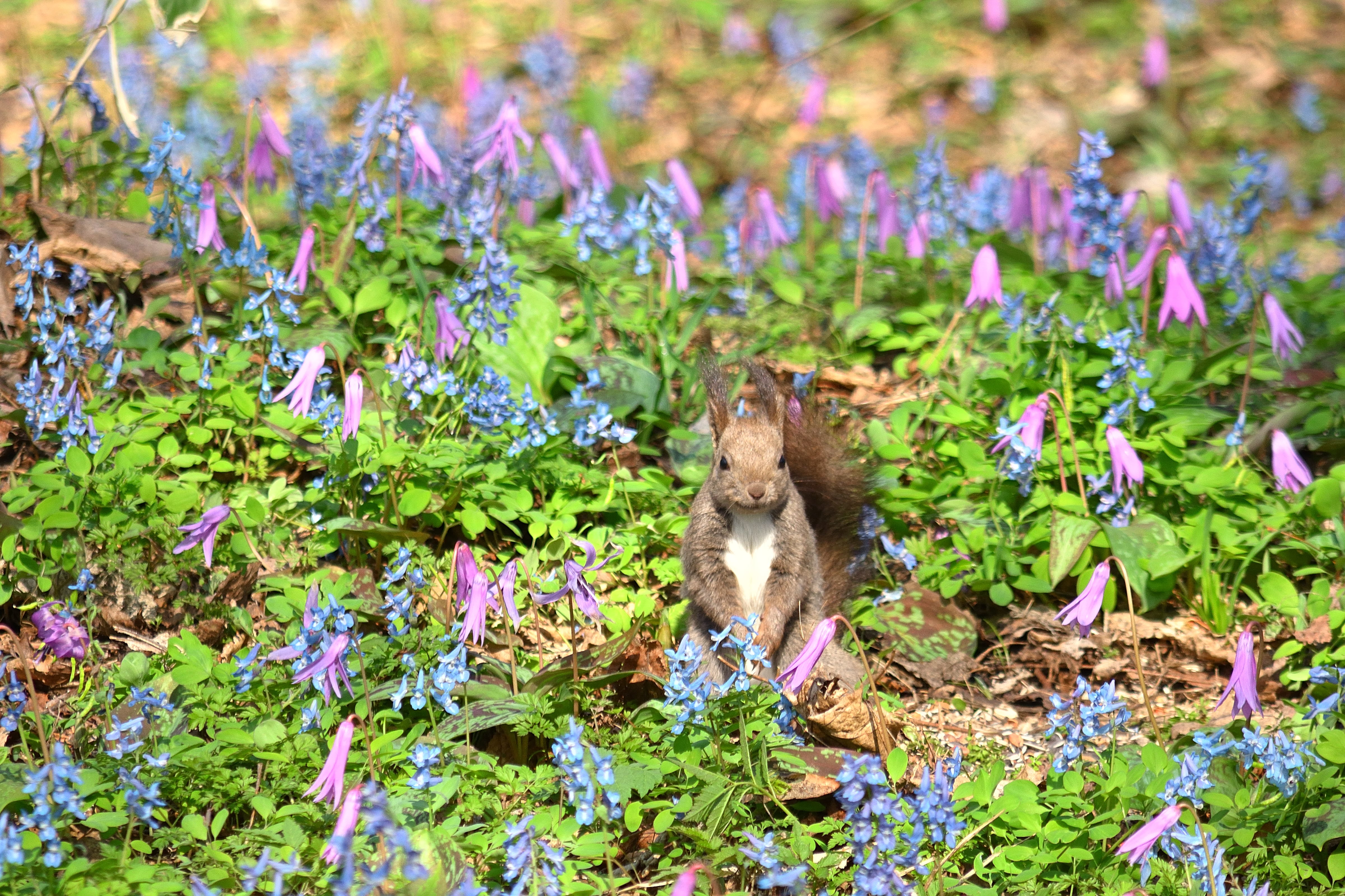 春遅い北海道です、春の陽気に咲くお花畑とエゾリスのフォトを撮りに早起きしてきました。