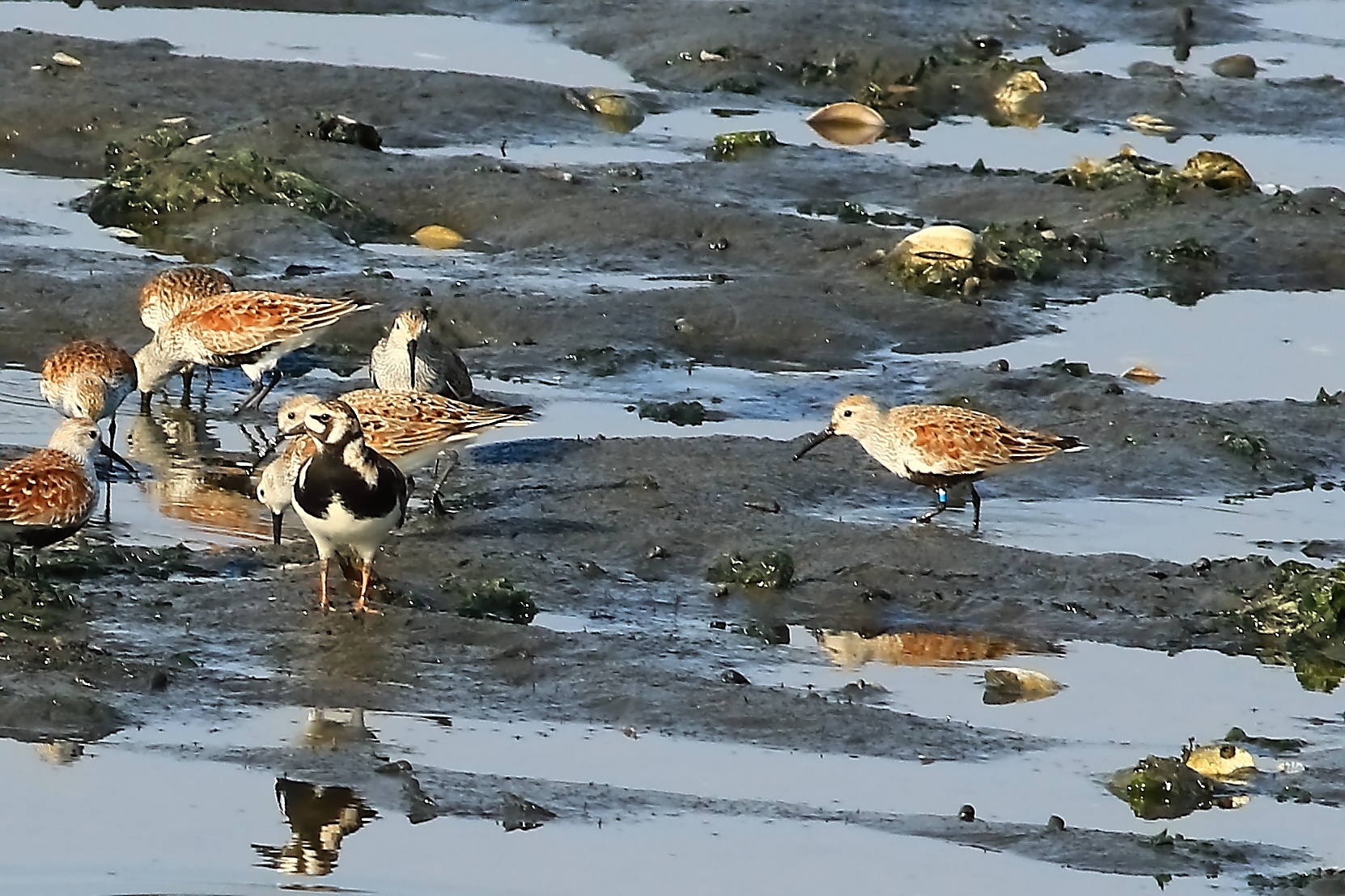 画面右のハマシギの左足にはフラッグが装着されています。関節の上に青色、本画面では分かりにくいですが関節の下に白色です。 このフラッグはここ谷津干潟を含む、東京湾エリアで過去に101個体に装着されたもので越冬地に戻ってきた証拠です。既に16個体が確認されています。