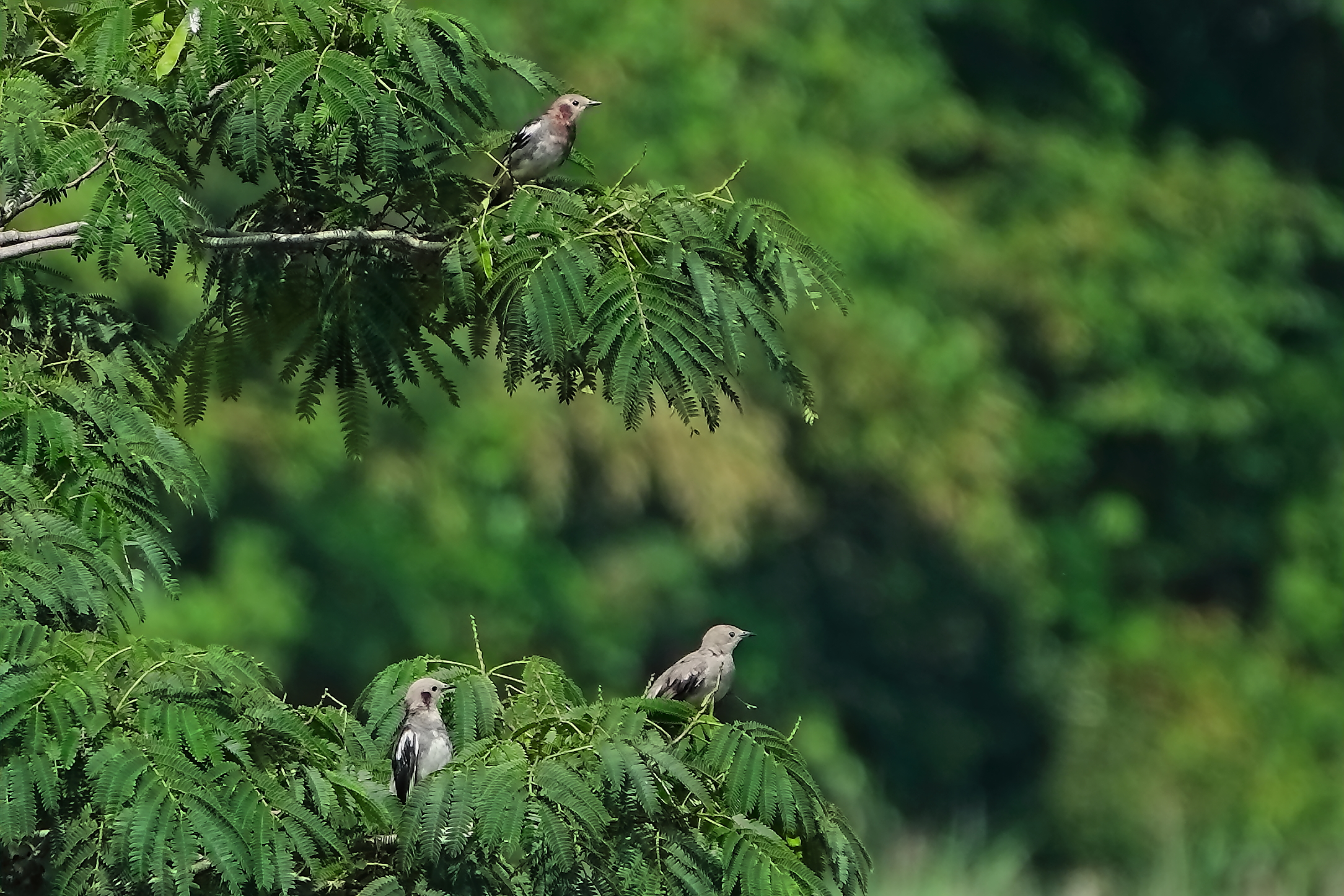 体長19㎝のコムクドリ、画面左の2羽が雄で右が雌です。雄の頬には茶色の斑点、ユニークでキュートな