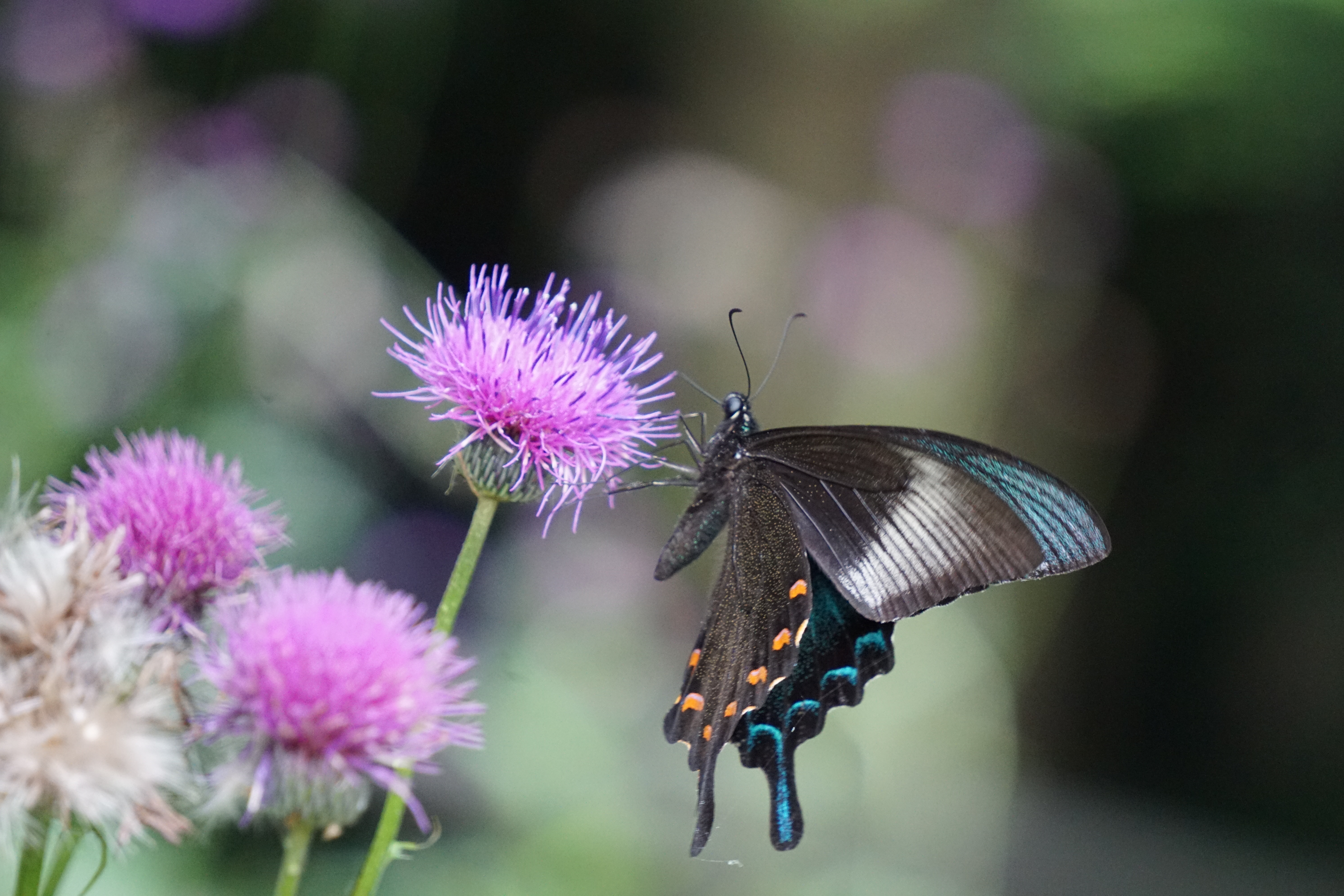 アザミにぶら下がり、必死に翅をばたすかせている蝶(カラスアゲハ)をマクロで撮ってみました。