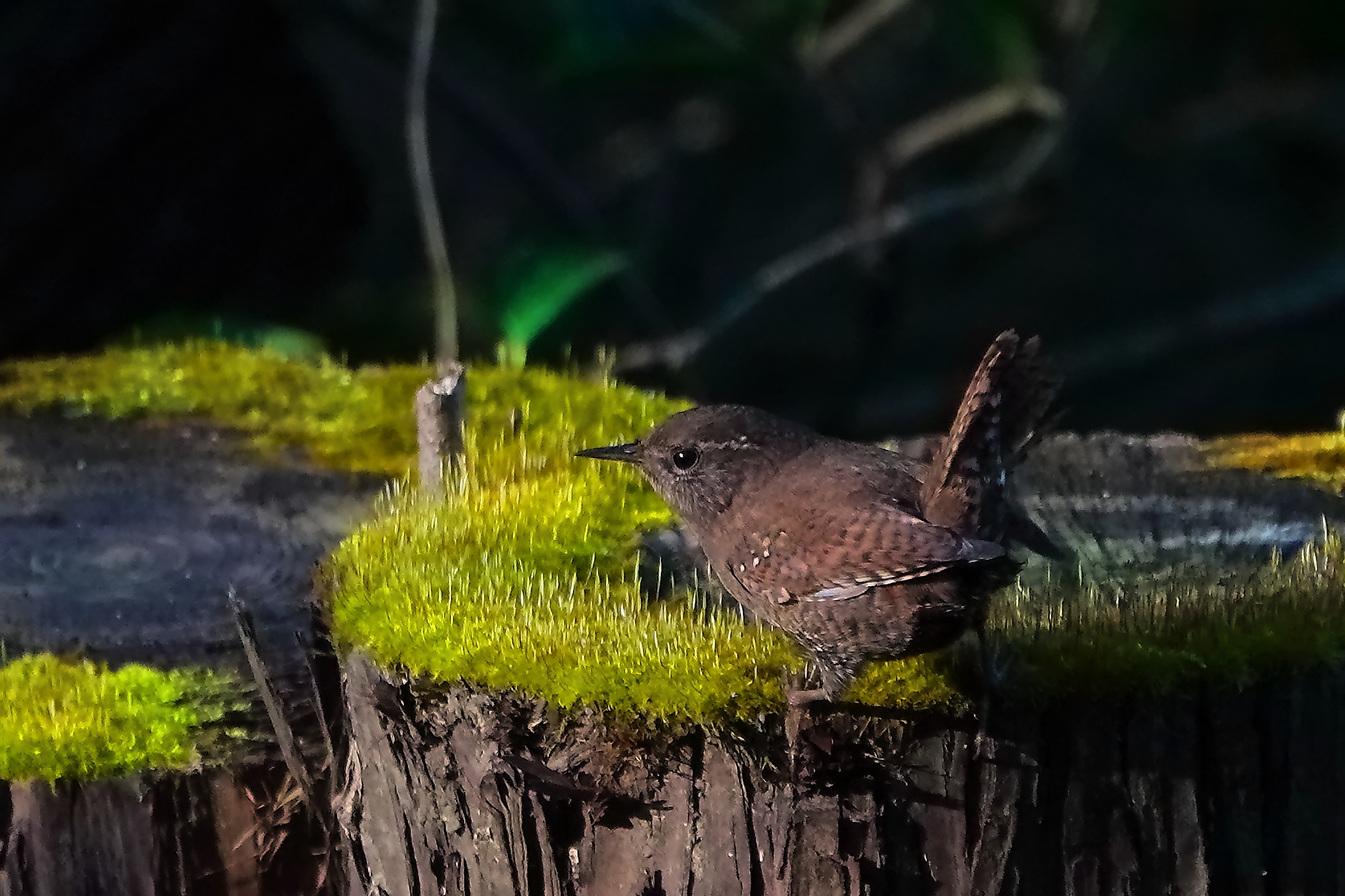 今年初撮りの日に苔の生えた切り株の上で尾羽を上げてくれました。