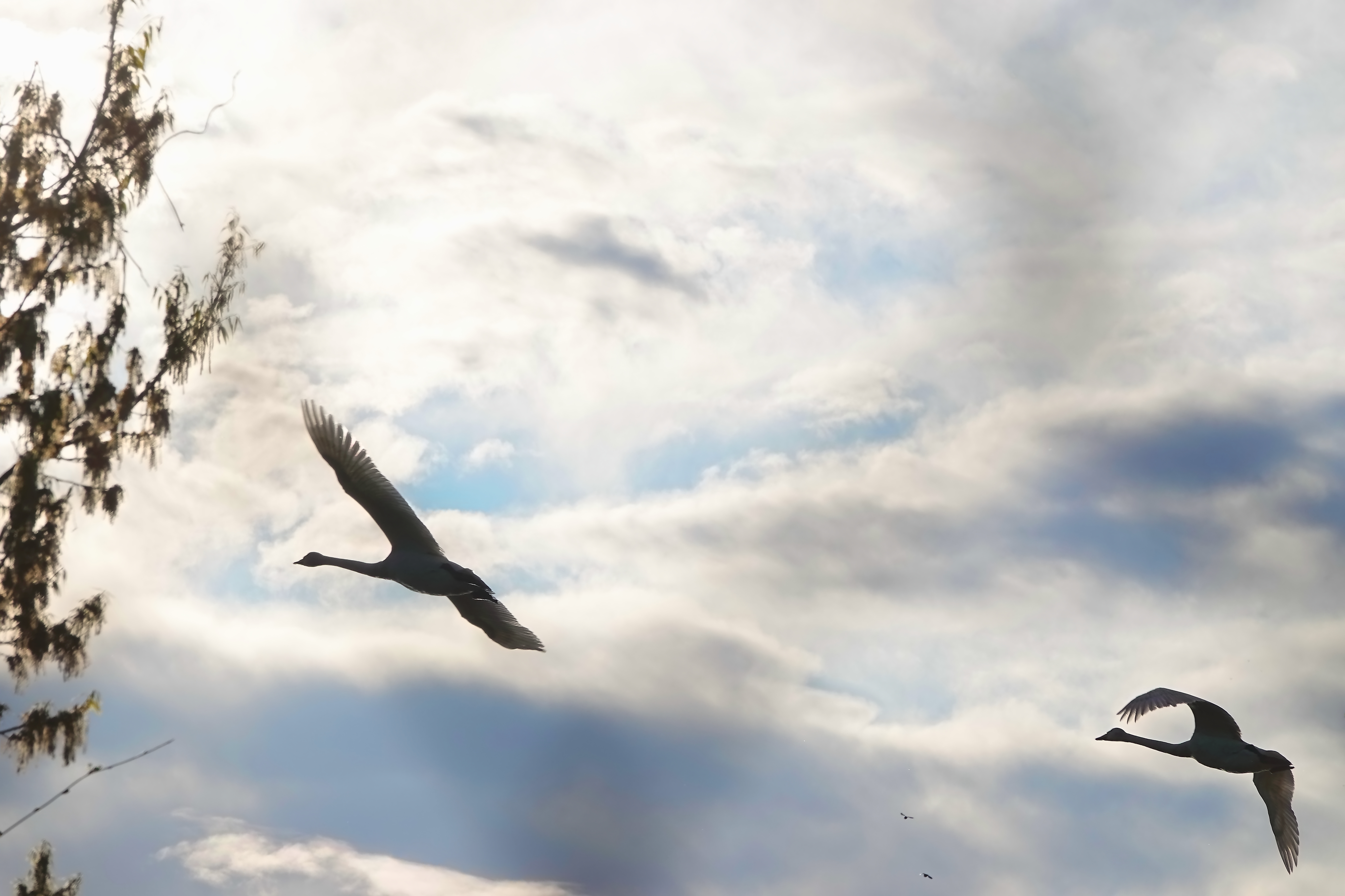 越冬中のオオハクチョウ43羽の内、体調不良の成鳥と幼鳥の2羽を残して既に3月25日までに41羽が北帰行しました。その後2羽は少しづつ食欲も出て、池の中を飛べるようになりました。昨日は早朝から2羽揃って池の周辺を2周しました。前を飛ぶのが快復の遅れていた幼鳥の方です。昨年までの26年間で最も遅い北帰行は2007年の4月16日でしたが、今年はそれよりも遅い北帰行になりそうです。
