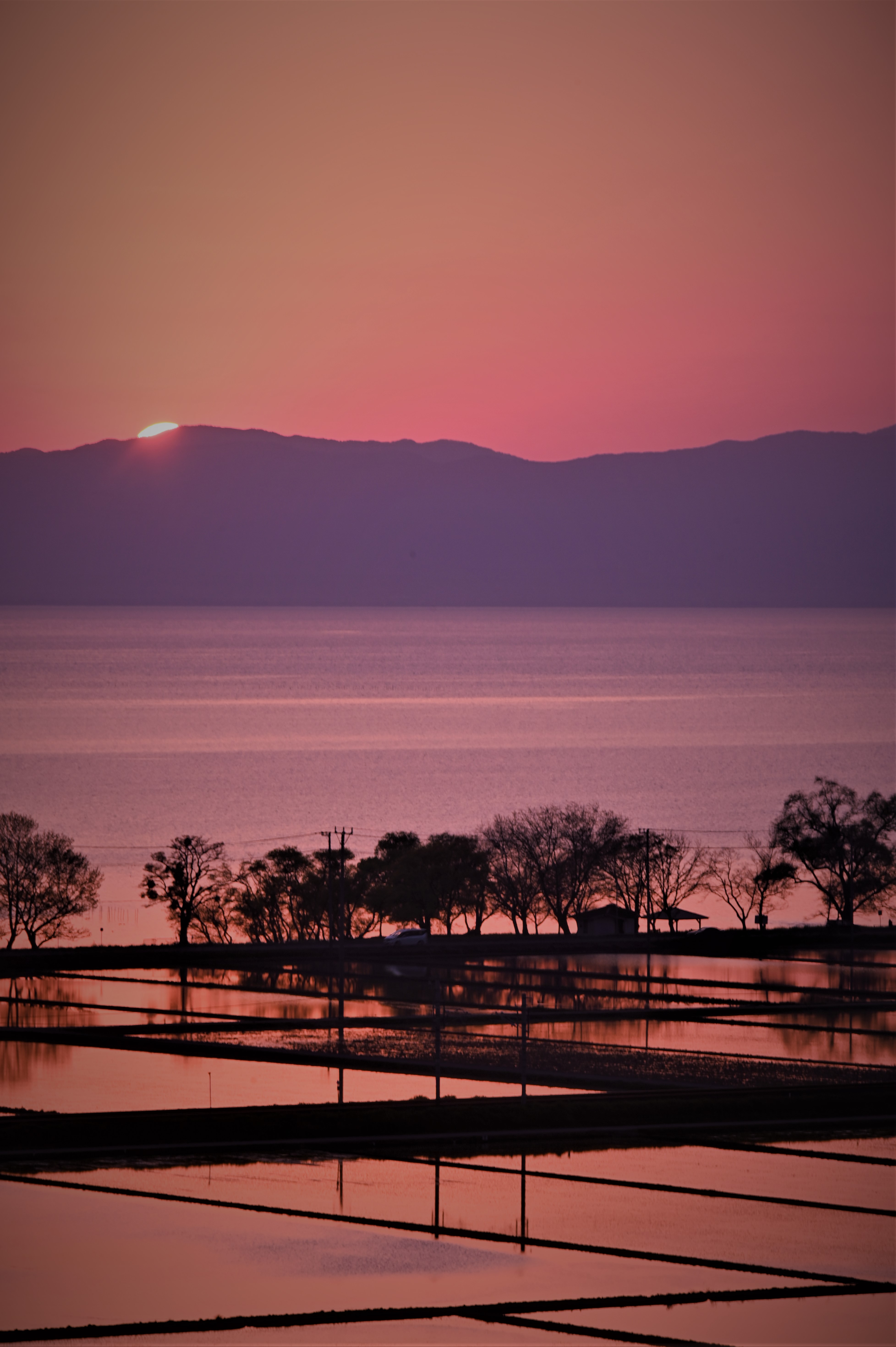 ほぼほぼ、沈んだ夕陽に照らされた水田の色合いが好きです。