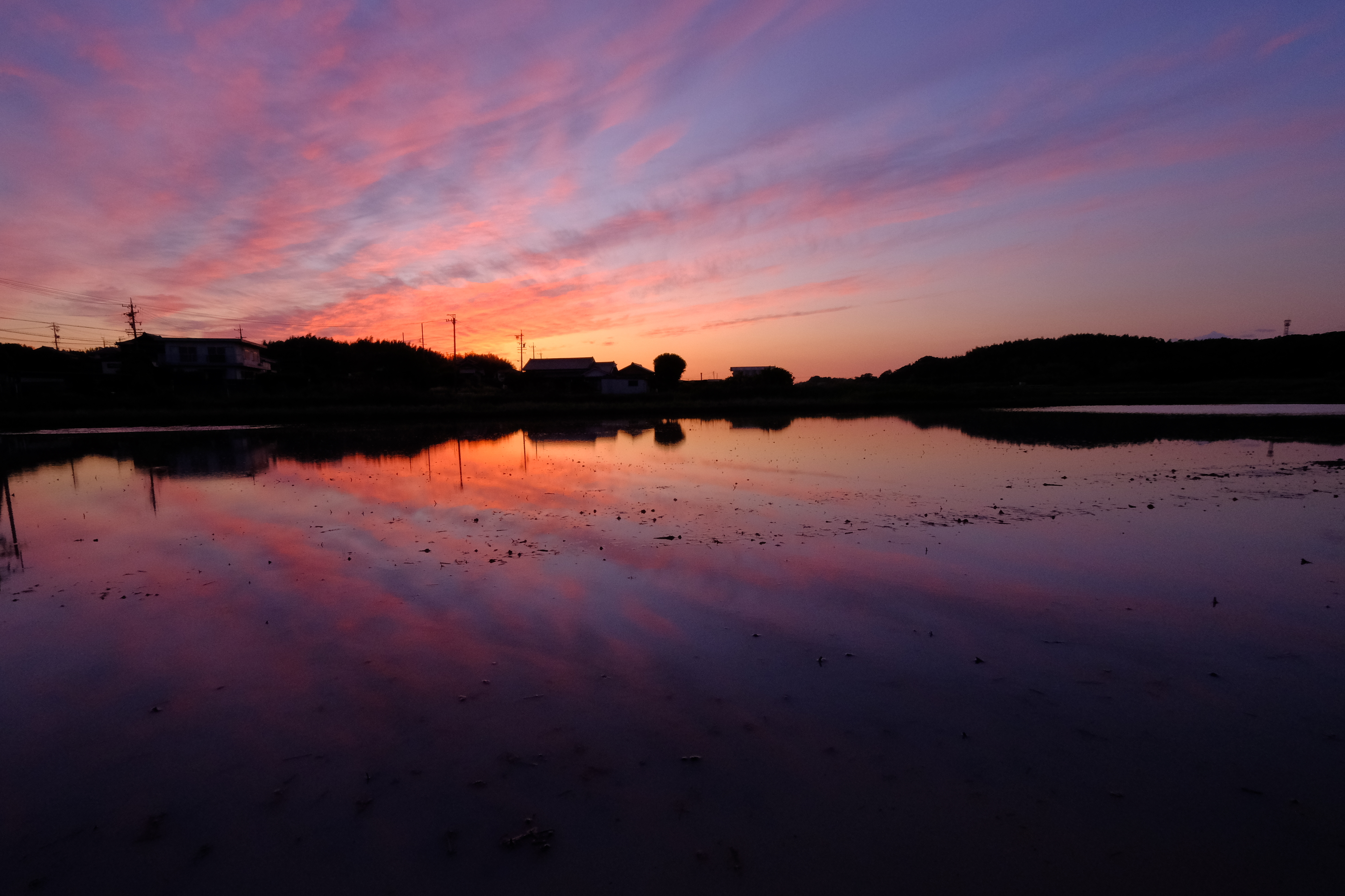 田植え前の水田に夕焼けを映し、今日の一日を見送ります。