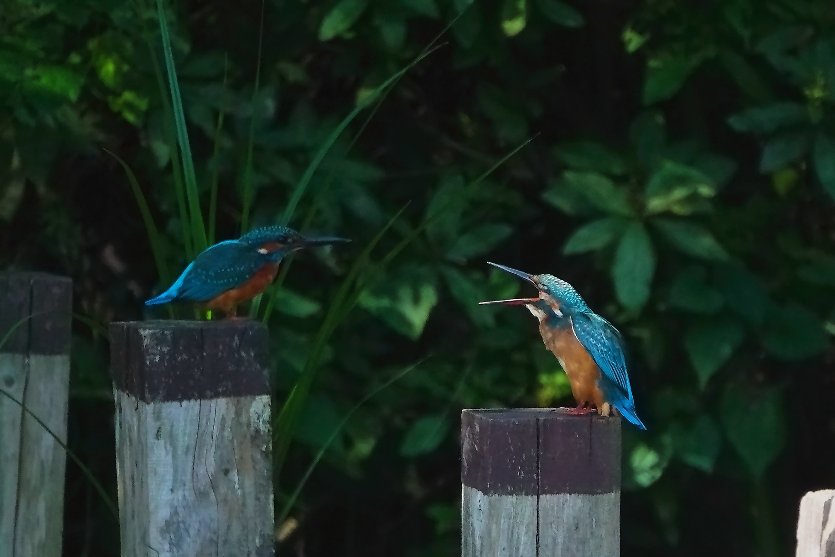 右の雌の幼鳥が左の雄の幼鳥を威嚇しているように見えますが、果たして・・・。
