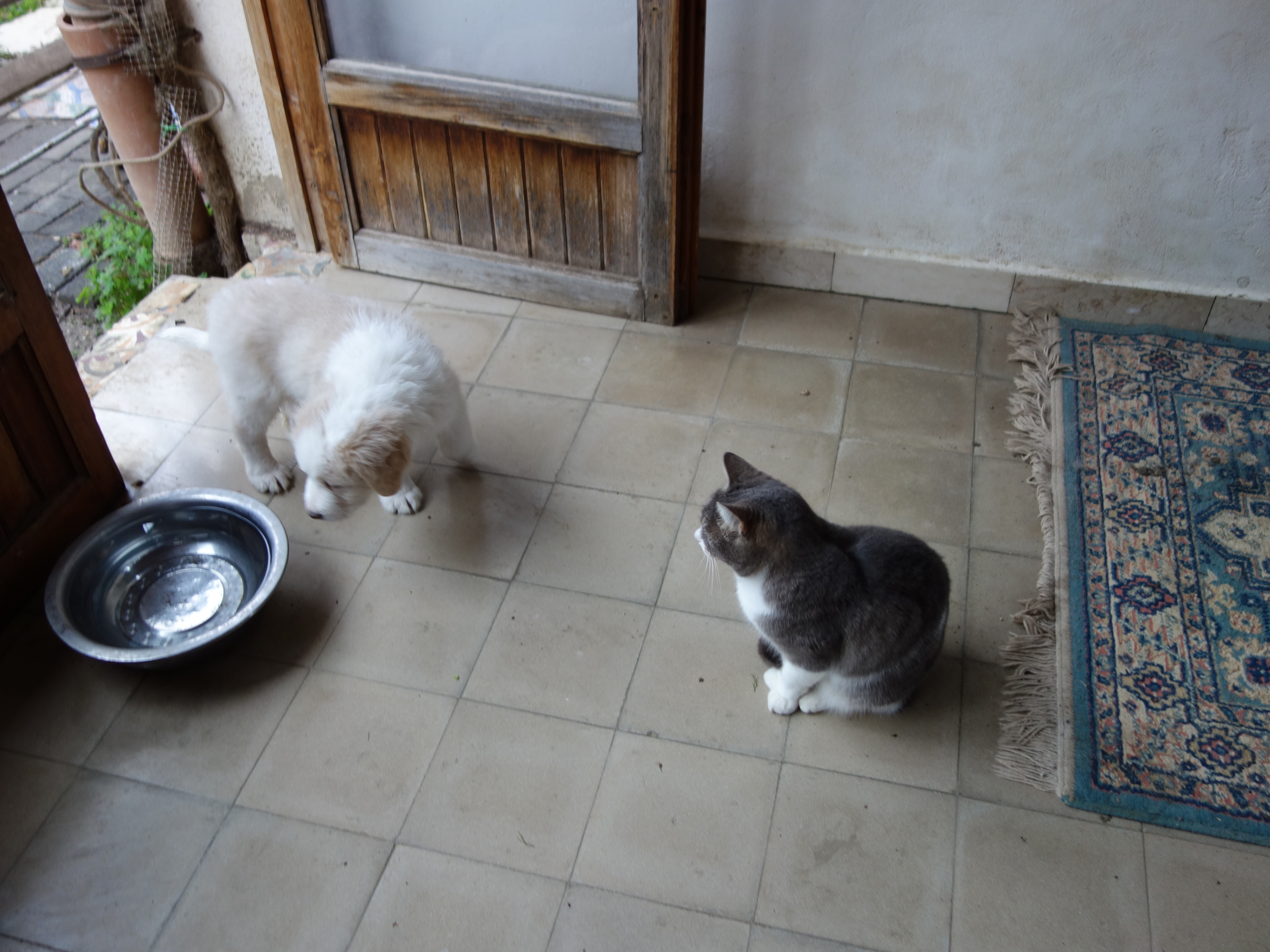 2歳8カ月のトッポ(雌ネコ)、ゼンが来た初日は、全身の毛を立てて憤っていました。が、ゼンが、わが家にいる他のイヌと同じで害がないとわかったのでしょう、もう、逃げません。