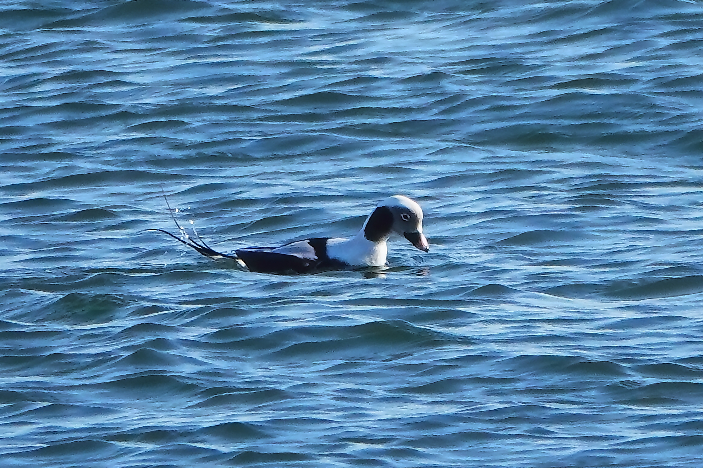 コオリガモの雄の羽はオナガガモの雄のように長く、それよりも細いです。