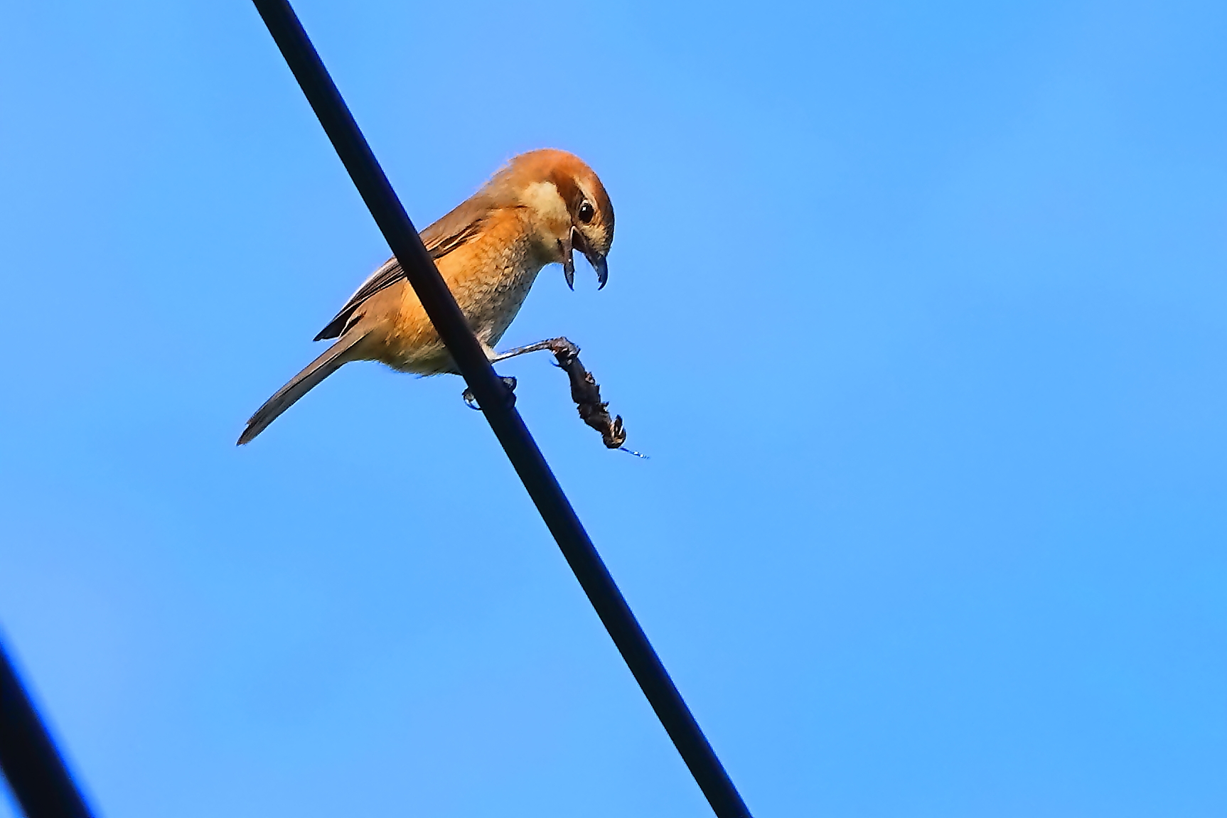 ケーブルで大きな虫を咥えながら、鳴いて薮の中のヒナの巣立ちを促していたモズの雌親。