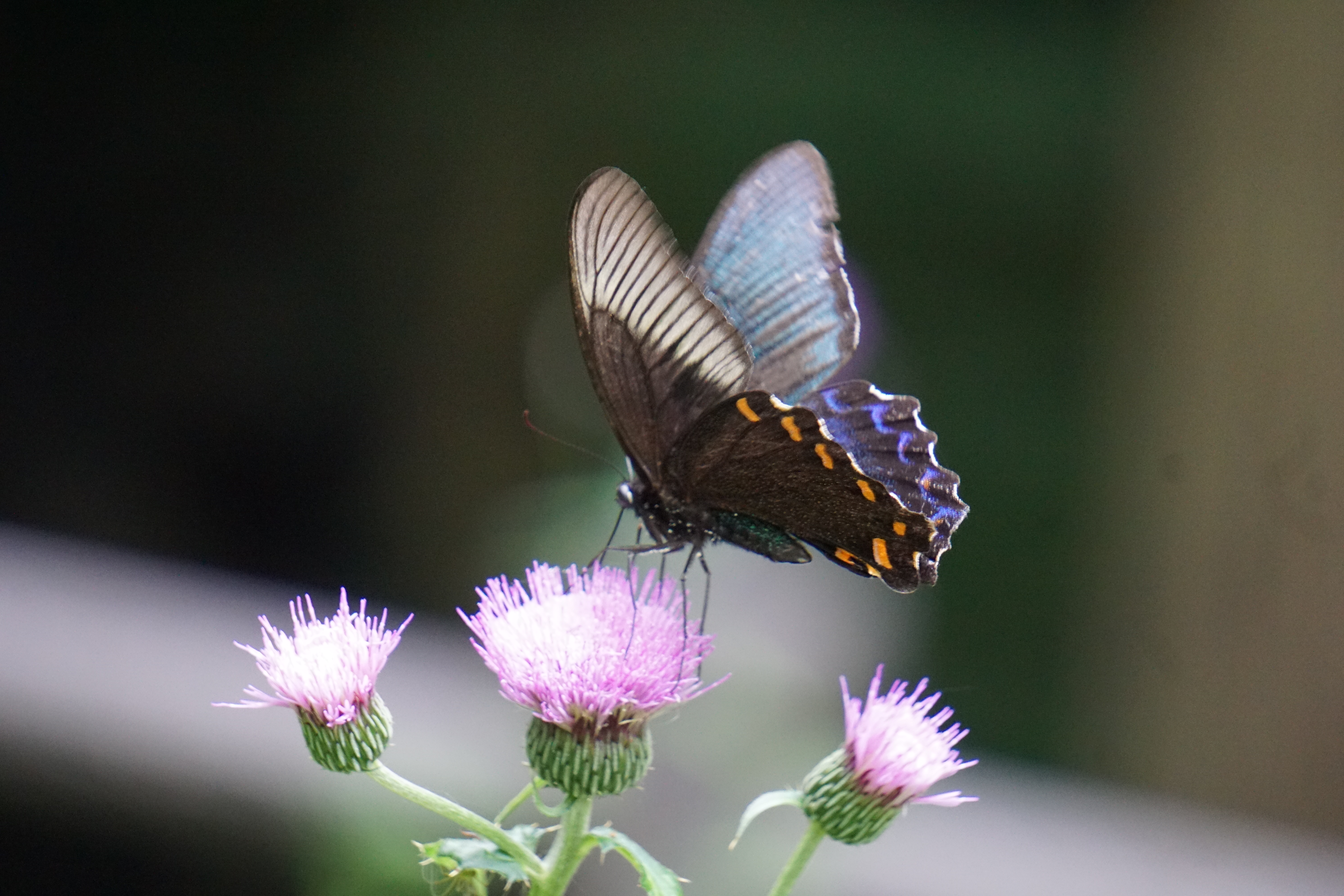 飛びながらノアザミの蜜吸う「カラスアゲハ」連射で撮ってみました。