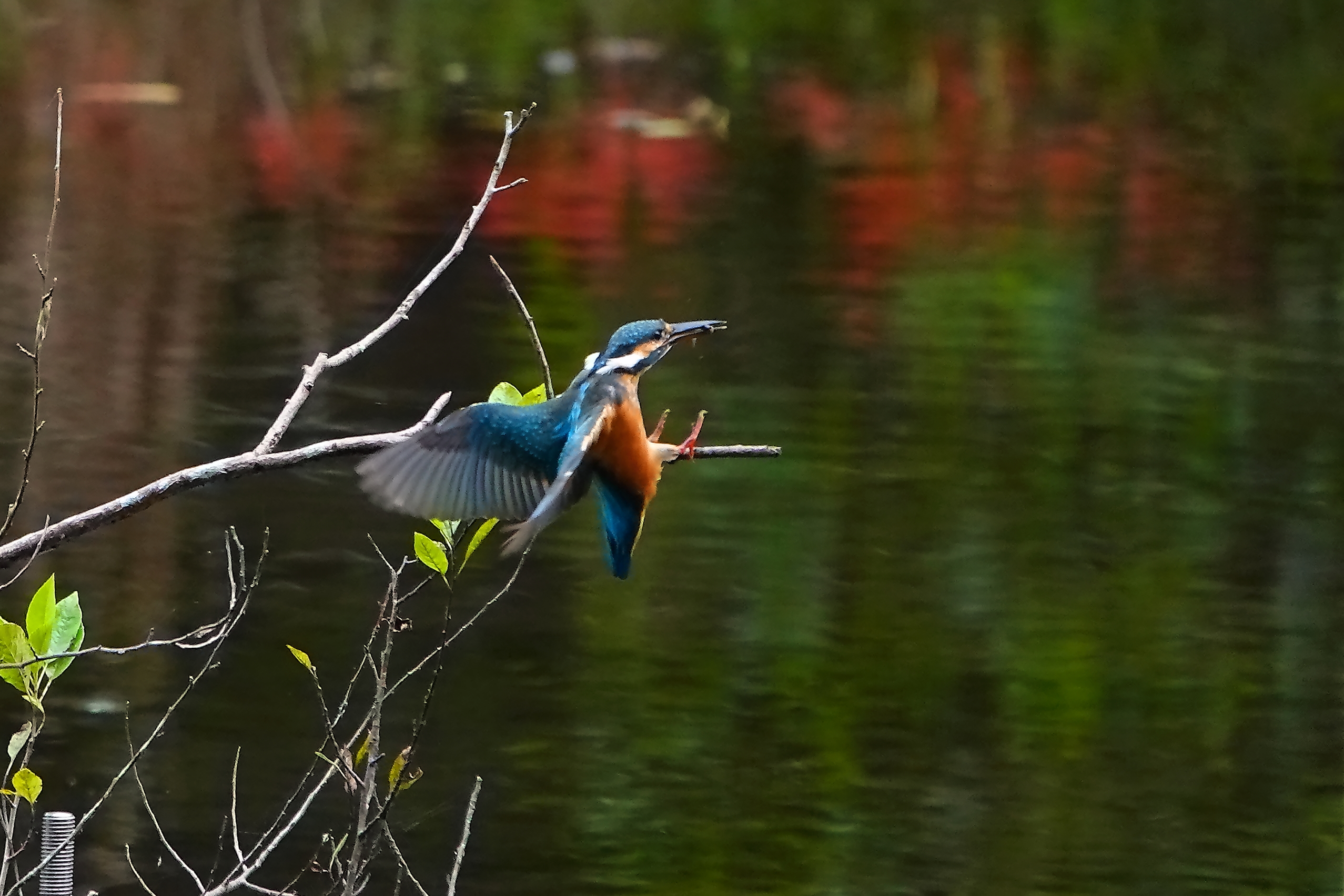 彼岸花が映り込む池の小さなハンノキの枝を気に入ってくれたのかカワセミの姉、