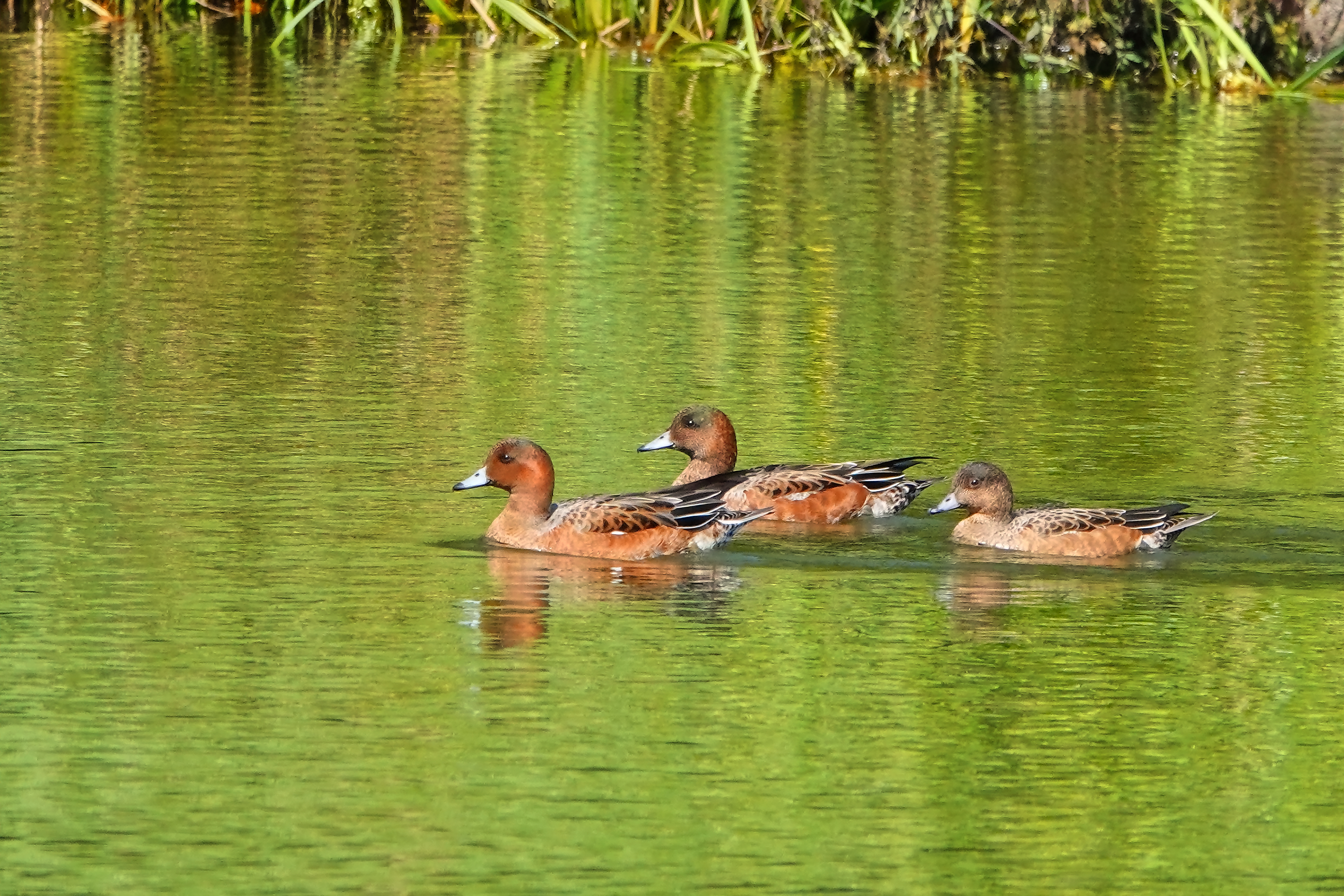 静かな広い池に漸くヒドリガモが3羽姿を見せました。間もなく沢山の鴨達で賑わうことでしょう。認定NPO法人「バードリサーチ」によるとガン・カモ類の国内の生息記録ではヒドリガモはマガモ、コガモ、カルガモに次いで4番目の164,494羽カウントされています(2015年1月)。他の鴨に比べると陸に上がり、草地や農耕地で採食することが多く、短い嘴は啄む餌の摂取効率が高いとされています。陸上での採食中は天敵に襲われる危険から警戒のため時々頭を持ち上げ、その時間は水域から離れるほど、そして群れの個体数が少なくなるほど長くなるそうです。またオスの方がメスよりも警戒時間が長く、ペアの時に顕著だそうです。